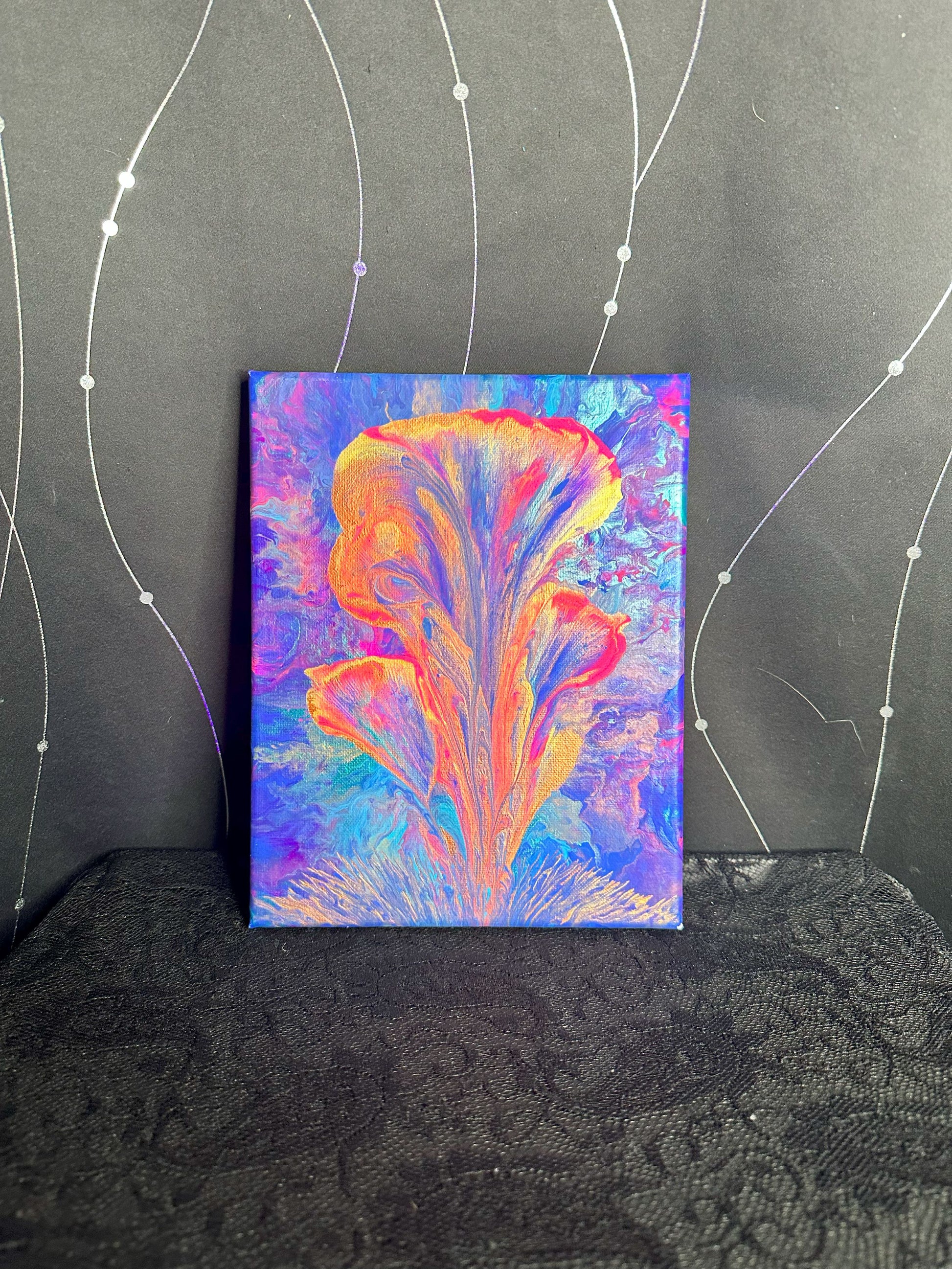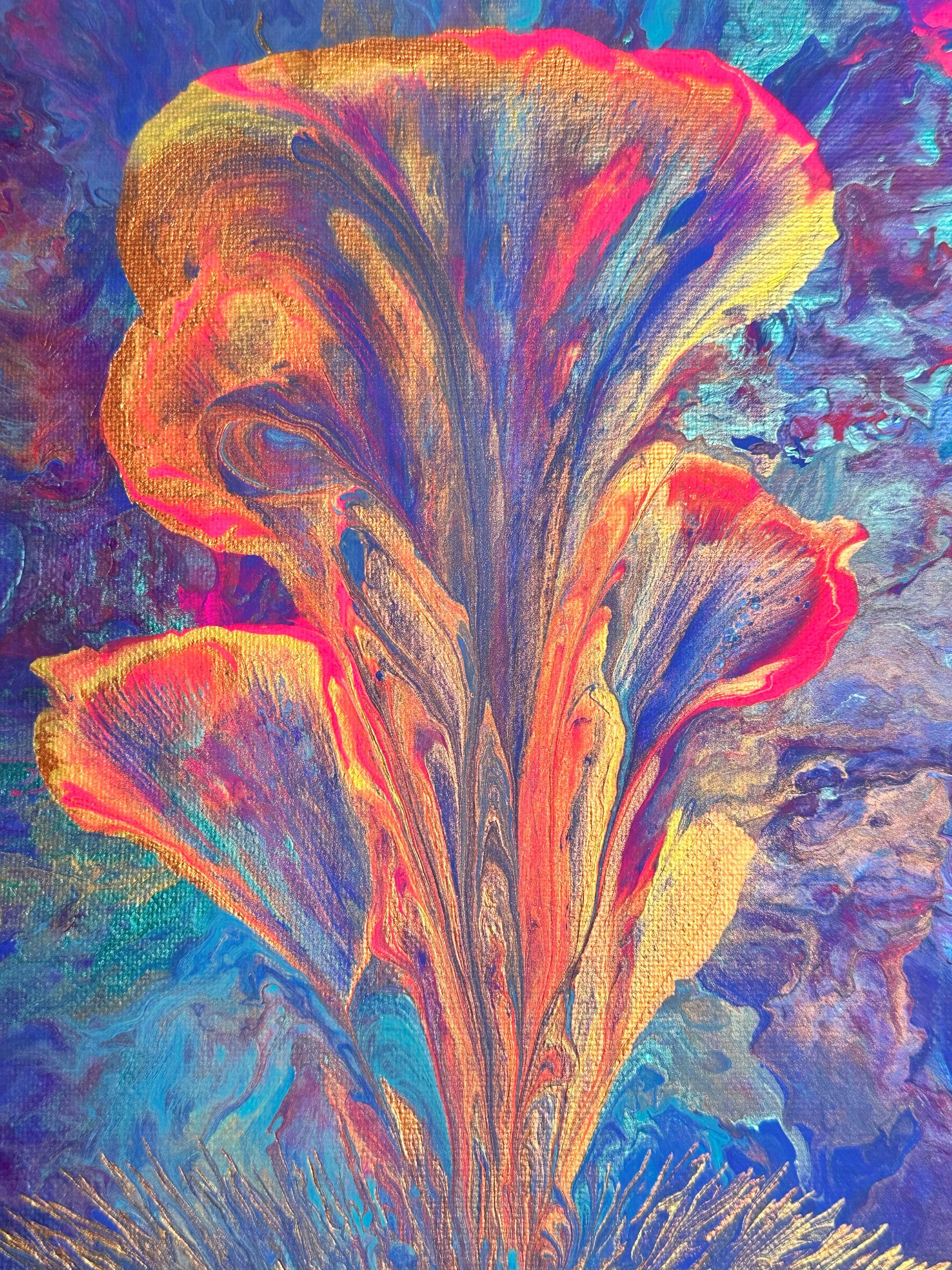 A stunning explosion of fiery oranges and pinks bursts forth like a blooming flower against a swirling cosmic backdrop of deep blues and purples. This abstract pour painting radiates energy, motion, and the mystique of natural beauty captured in vivid, flowing forms. Perfect for anyone seeking a dynamic piece to energize their space.