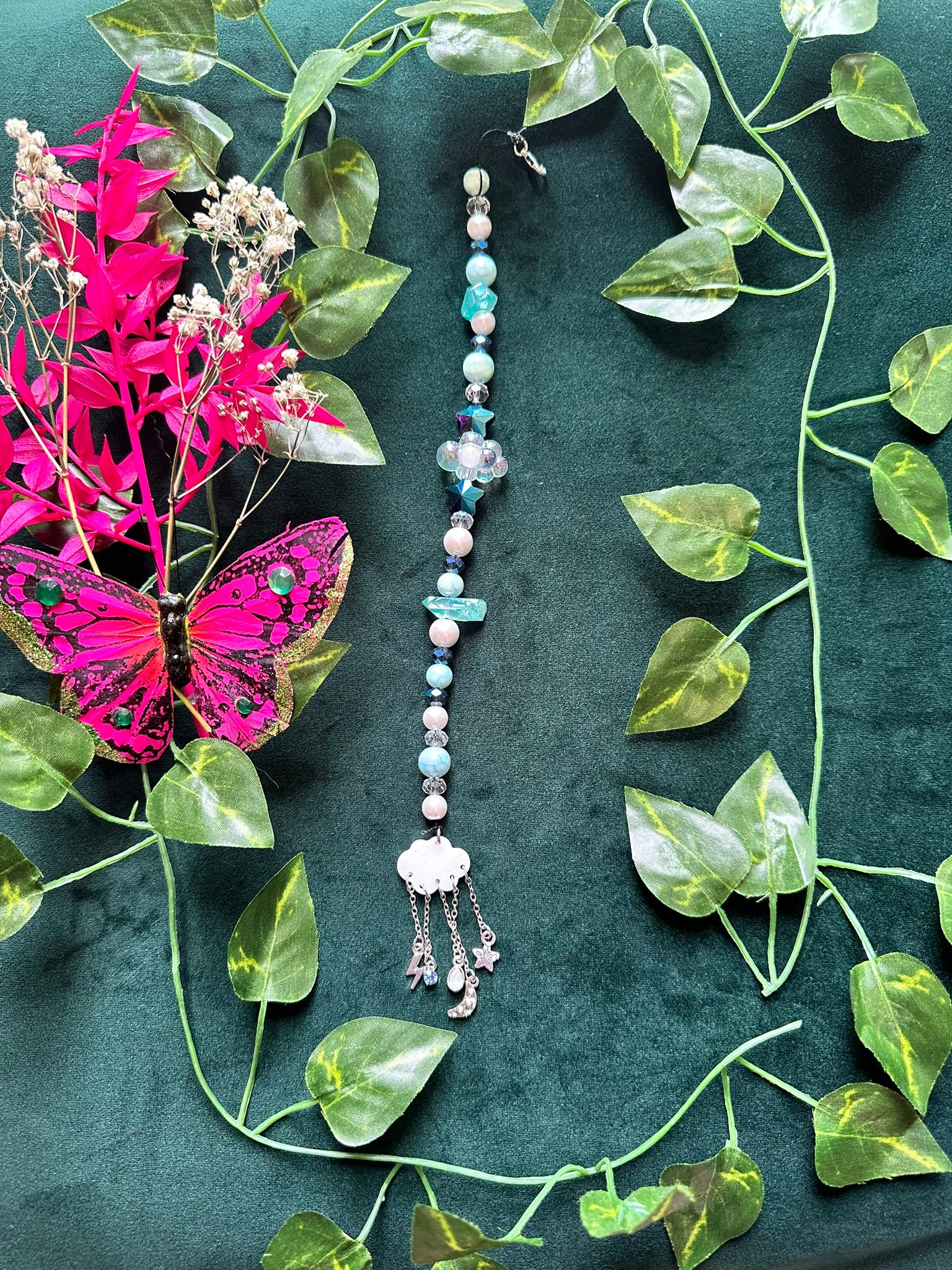 Sweet and surreal, this pastel sky-inspired piece glows with soft blues, pinks, and iridescent sparkles. A fluffy cloud charm finishes the look, complete with dangling stars and moons for dreamland realness.