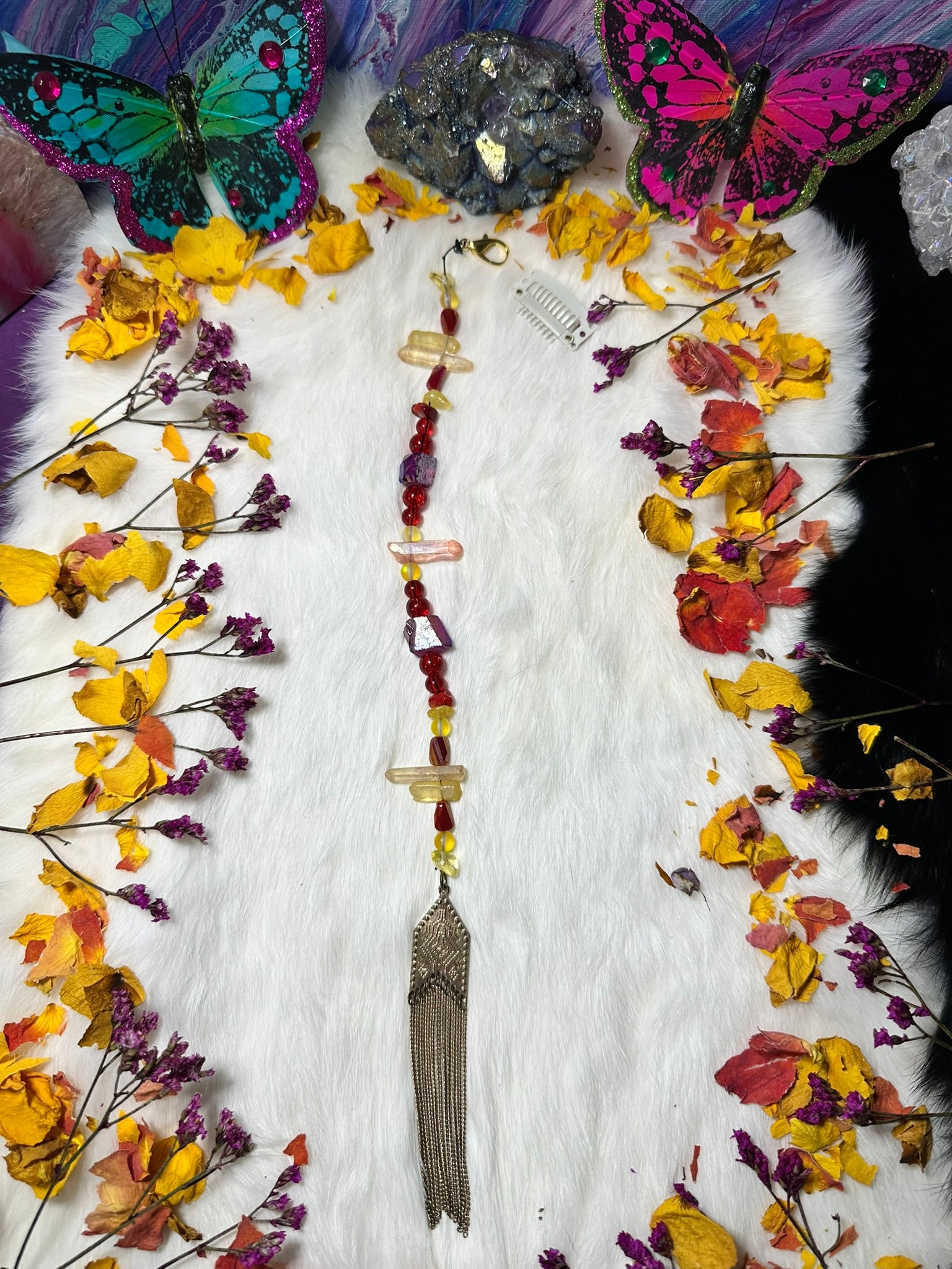 Channel the energy of golden sands and blazing sunsets with the Desert Dancer Flow Charm. Featuring earthy red stones, amber tones, sun-kissed crystals, and a vintage-inspired bronze chain tassel, this piece flows like a desert breeze and shimmers with grounding fire. Perfect for boho baddies, fire signs, and festival warriors who walk their own path.