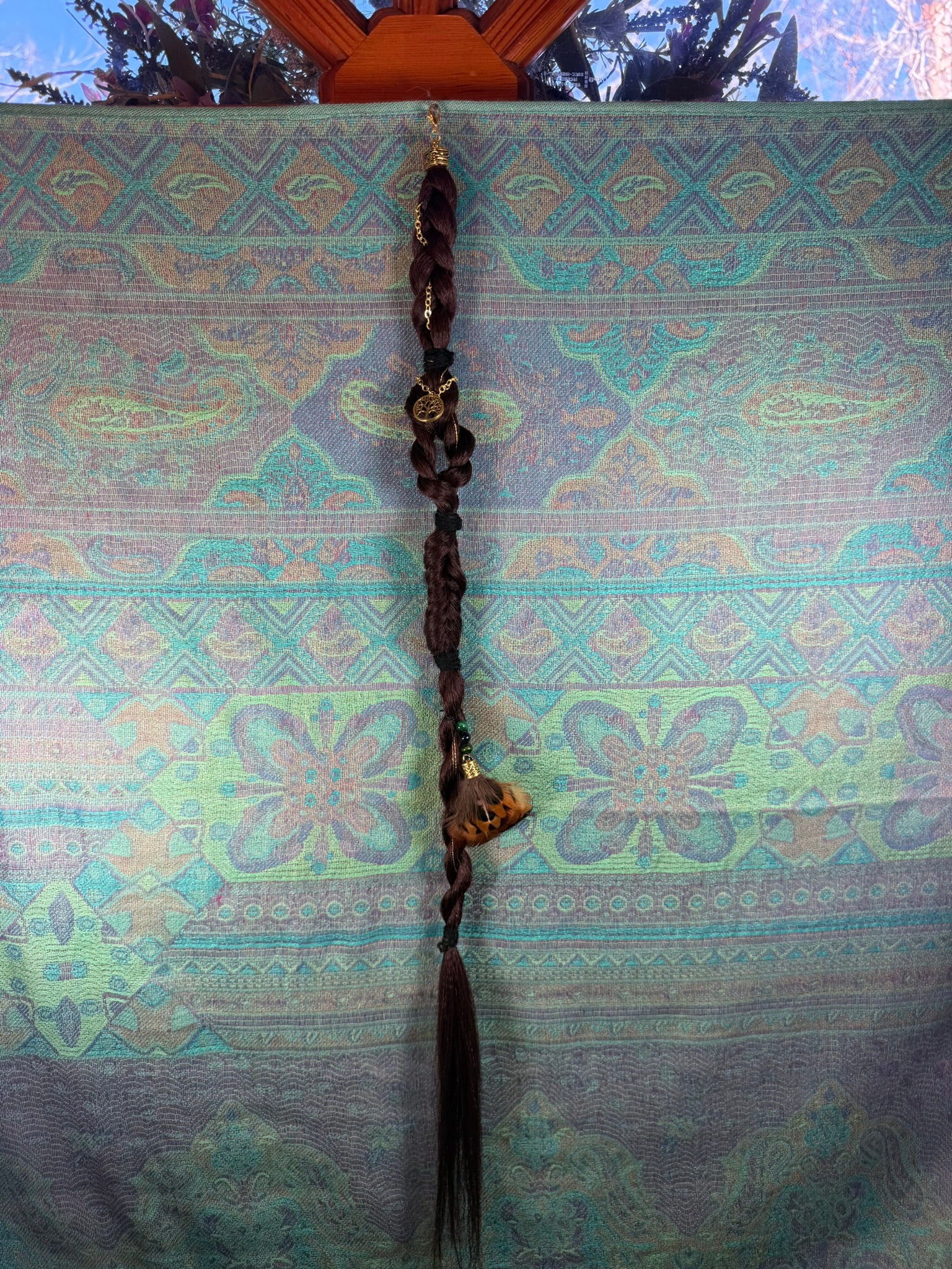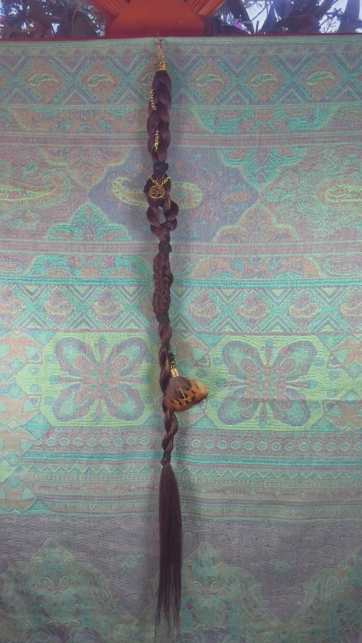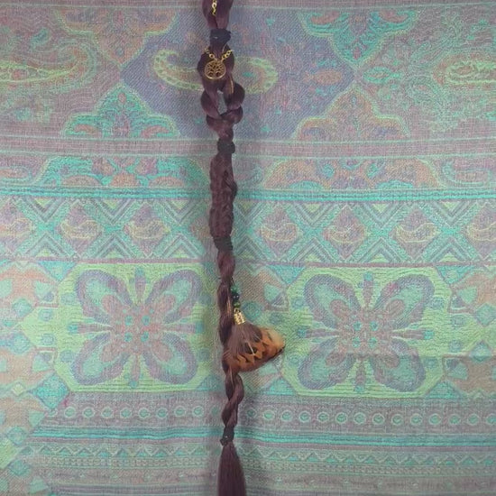 Forest Keeper features deep natural brown tones woven into layered braids with gold chain accents and a pheasant feather charm that moves gently with every step. The pheasant feathers are ethically sourced in Montana by a family member, giving each piece a meaningful connection to the land it came from.