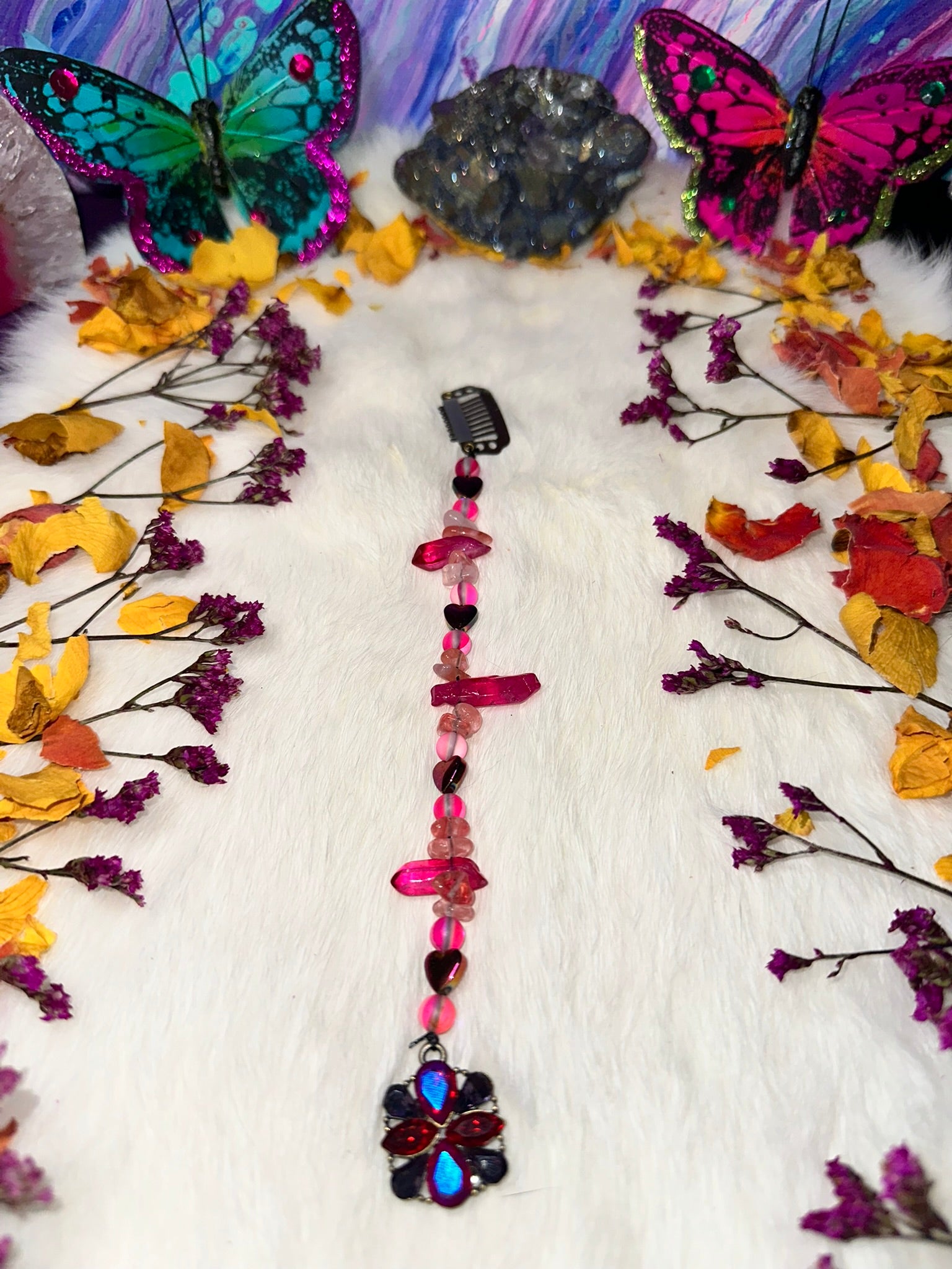 Bring bold romance and fierce energy to your flow with the Heartbreaker Flow Charm. This radiant piece pairs hot pink and ruby-red beads with heart-shaped accents and a dazzling iridescent flower pendant. With layered textures and vibrant crystal-like shards, it’s made to catch the light—and some hearts—everywhere you go.
