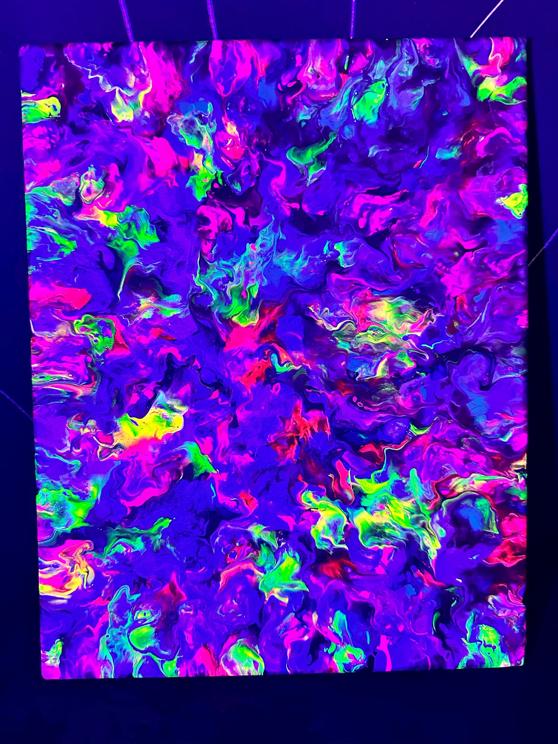 This electrifying artwork bursts with vibrant swirls of pinks, blues, purples, and greens that come alive under blacklight, creating a mesmerizing glow. The dynamic composition feels like a cosmic explosion, with colors dancing and intertwining like a nebula in the depths of space. Perfect for adding energy and a futuristic vibe to any space, day or night!
