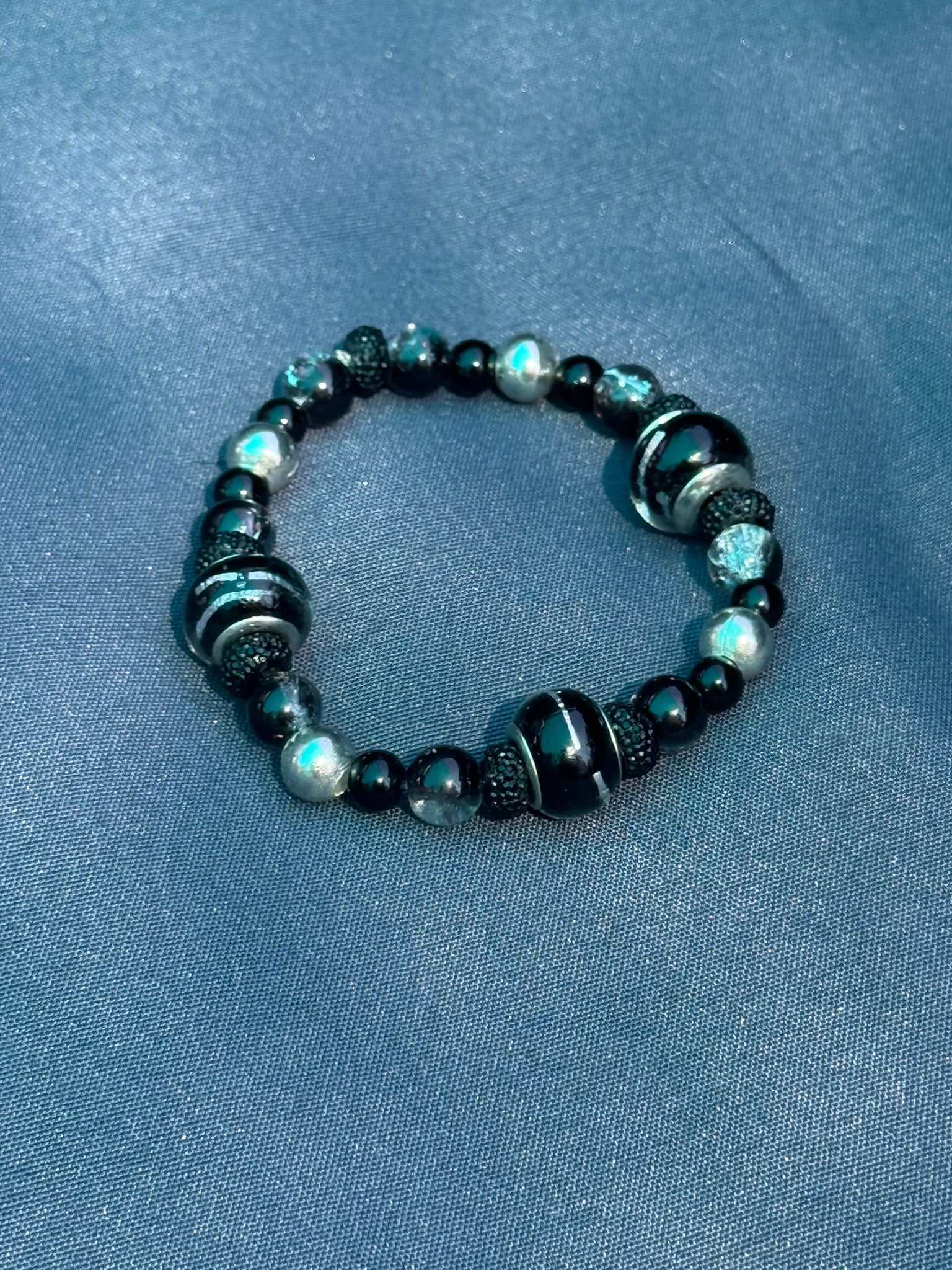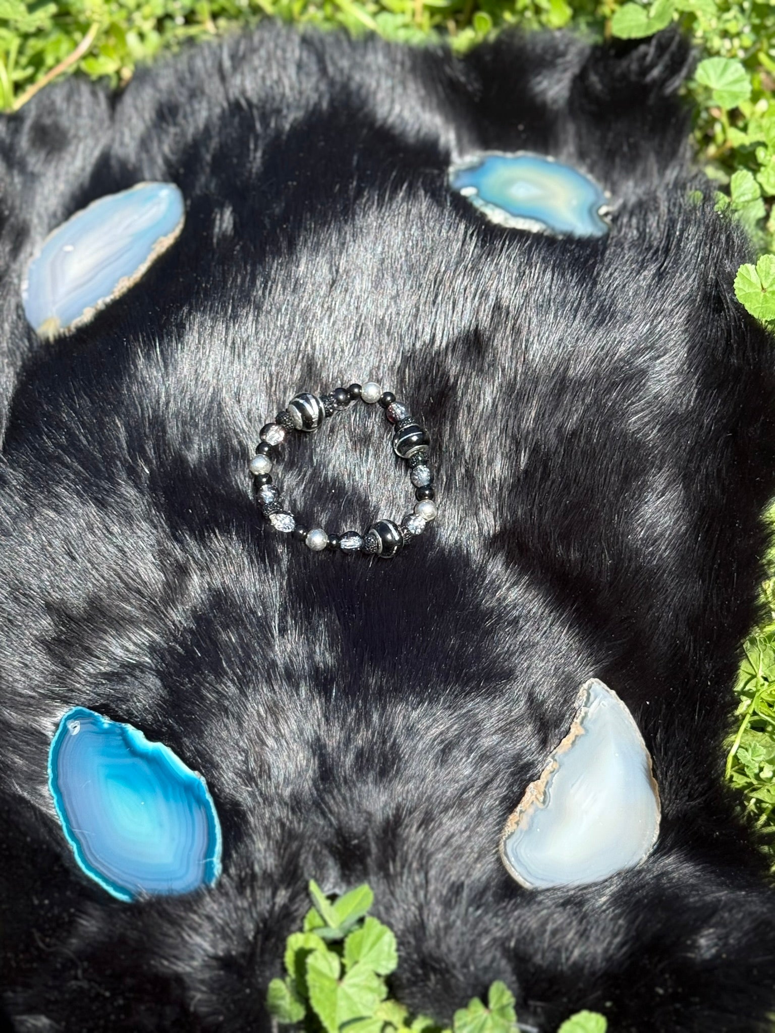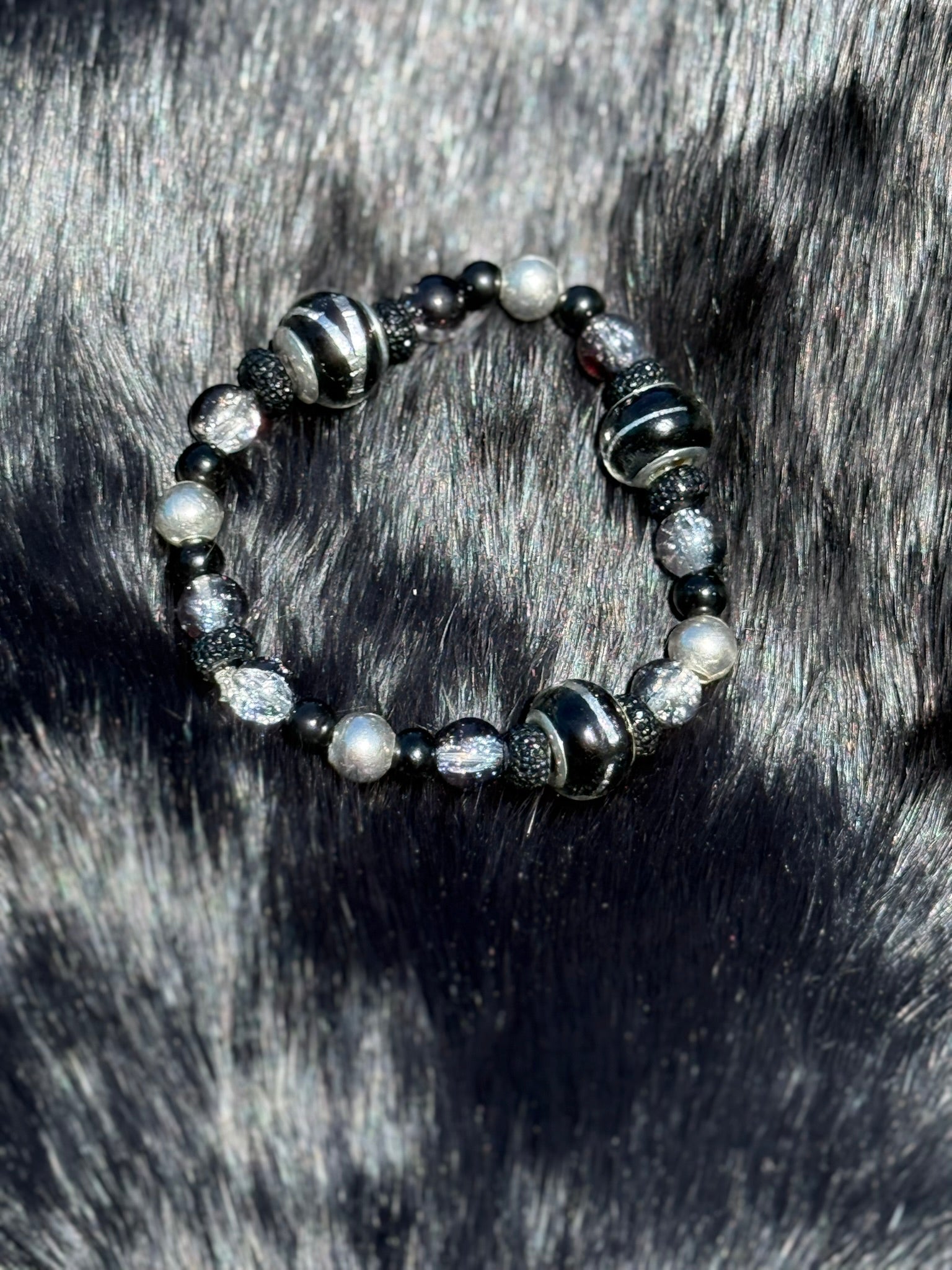 Black, silver, and smoky tones meet celestial shimmer for a bracelet that feels both mysterious and timeless. Balanced and bold, it’s perfect for moonlit nights and cosmic dreamers.