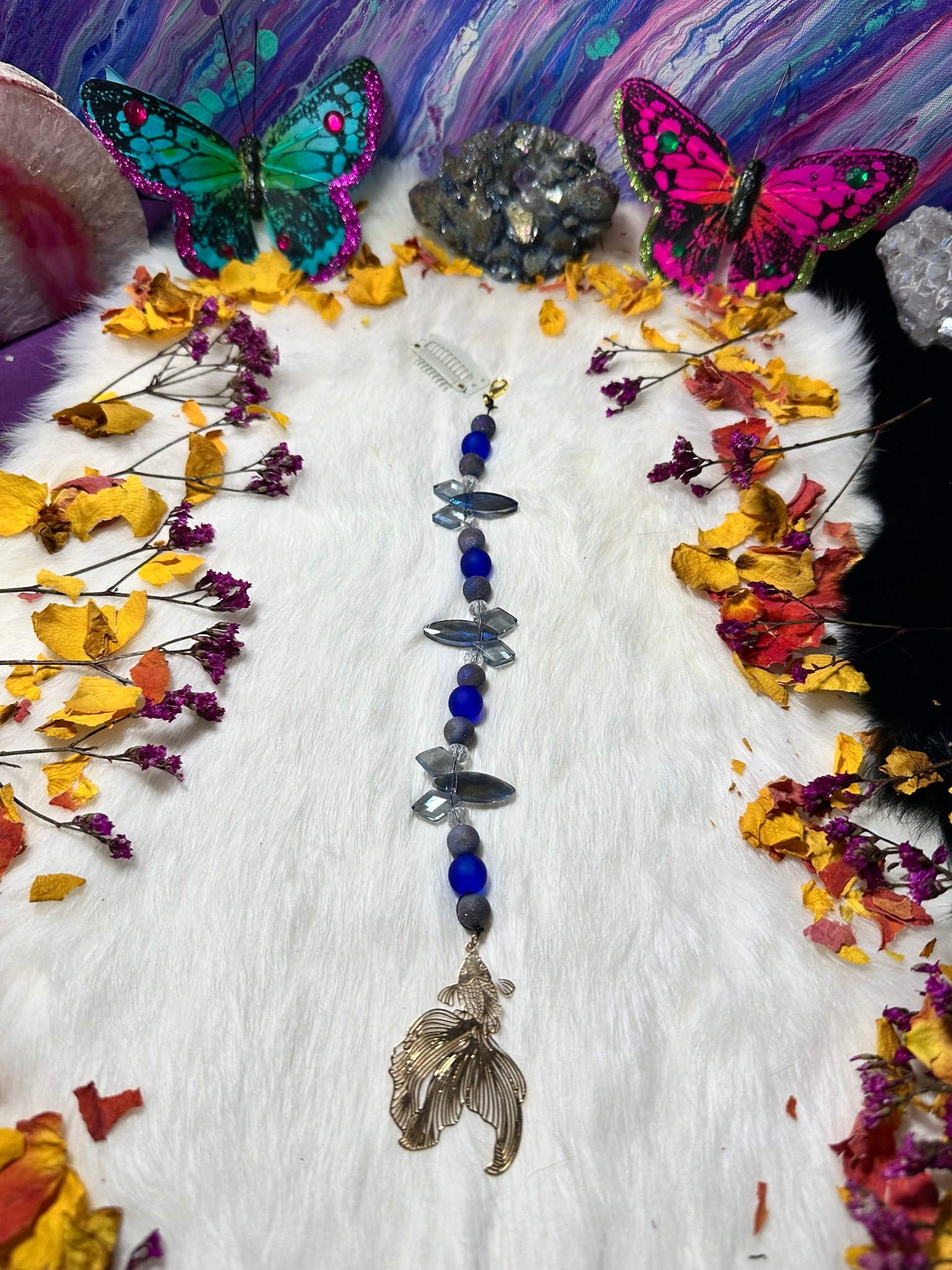 Swim through sound and stardust with the Midnight Koi Flow Charm. This serene piece combines deep oceanic blues and soft matte stones with faceted glass beads that mimic rippling water. Anchored by an elegant metallic koi fish pendant, it brings a graceful, fluid energy to your hairstyle—perfect for chill vibes or water sign magic.