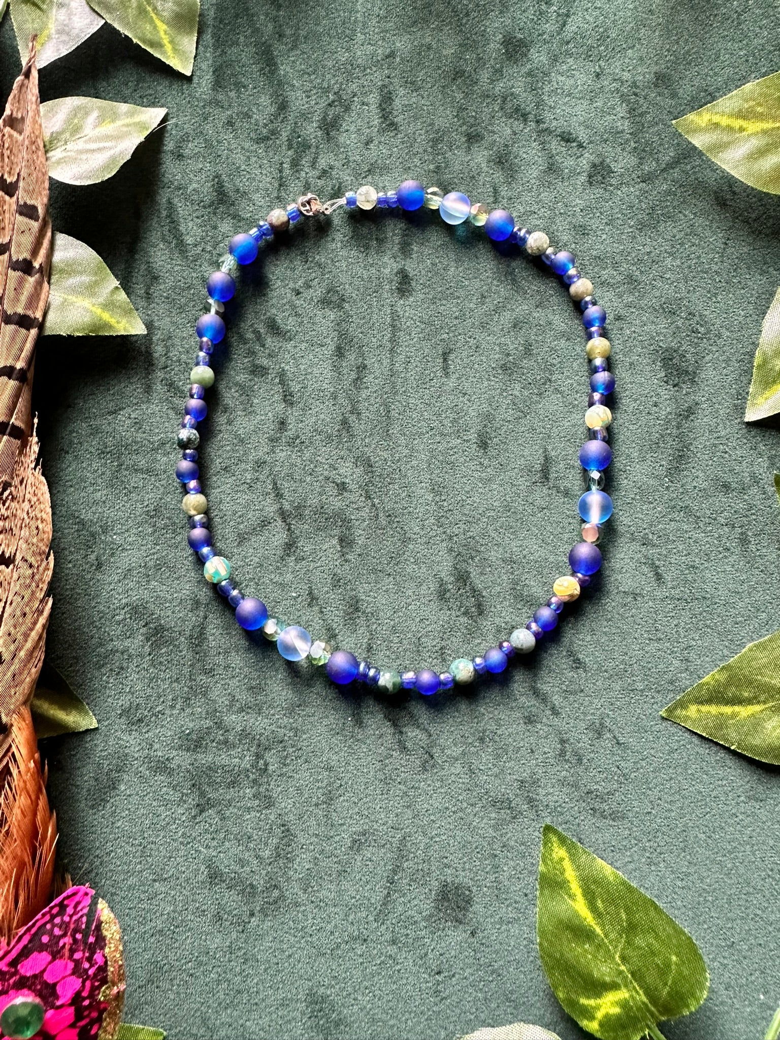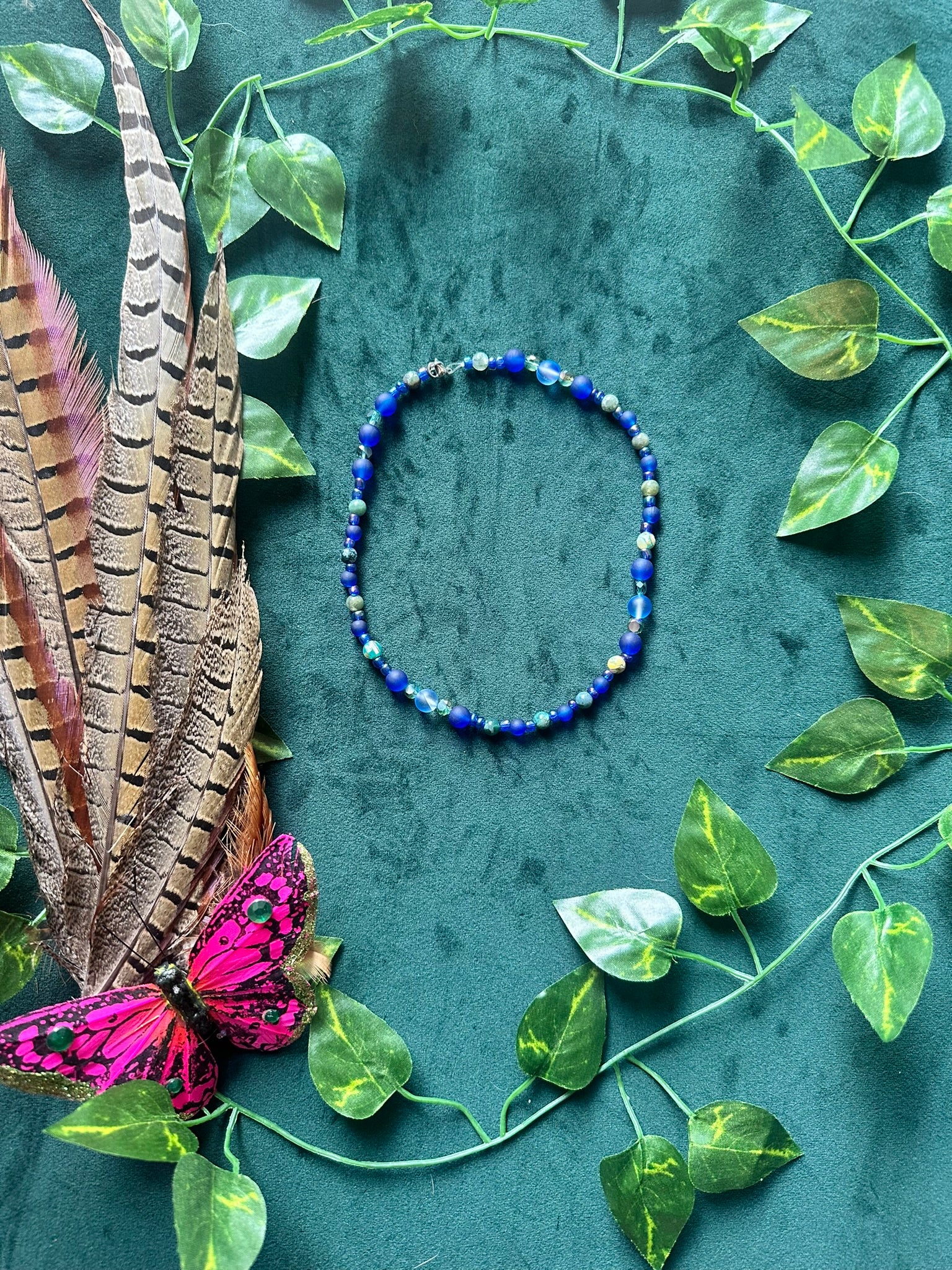 Lapis, silver, and galaxy-glow accents swirl in this deep-blue beauty. Midnight Orbit feels grounded yet otherworldly—an orbit of intention around your throat chakra. Perfect for star-gazers and dreamers alike.