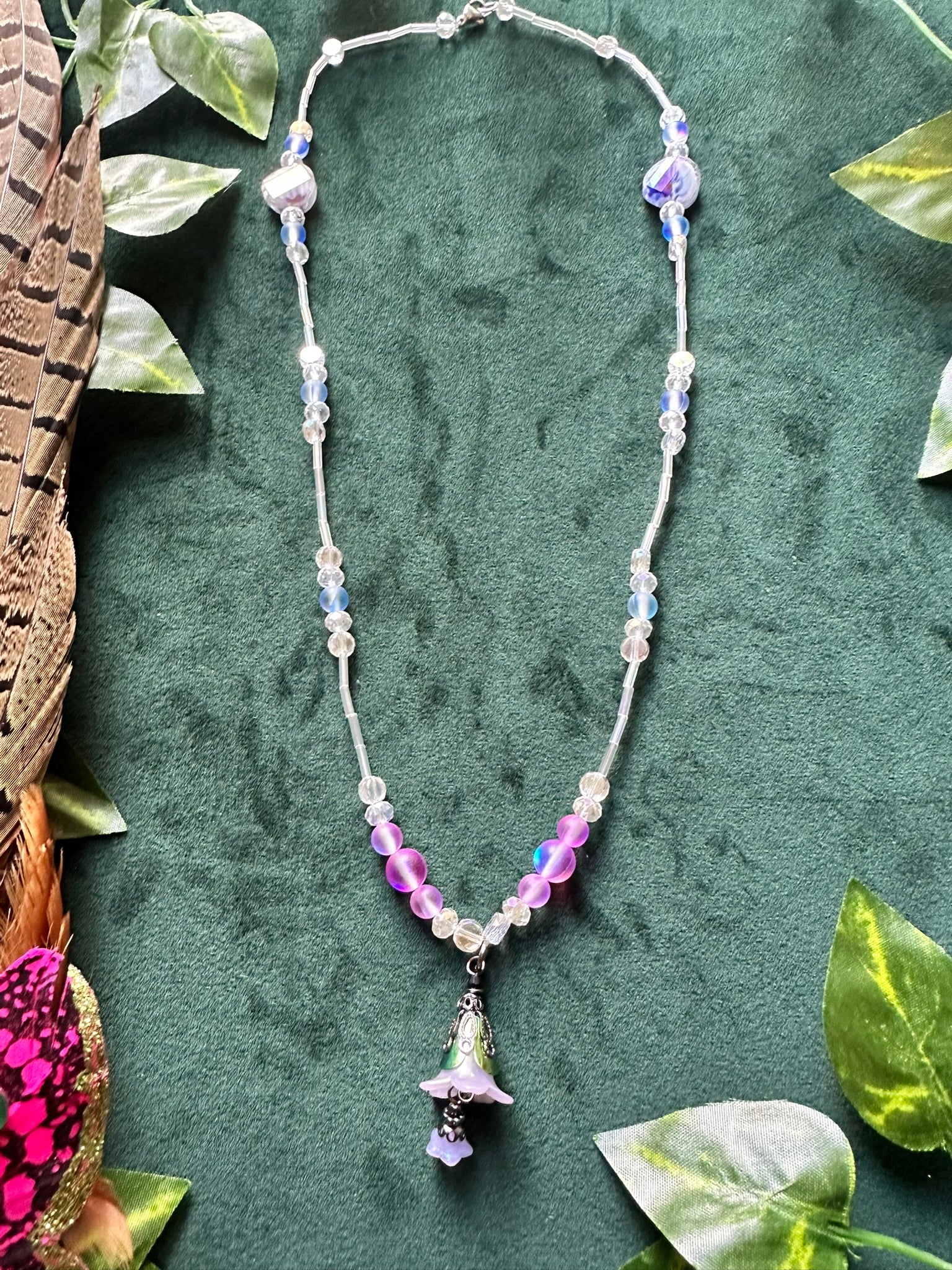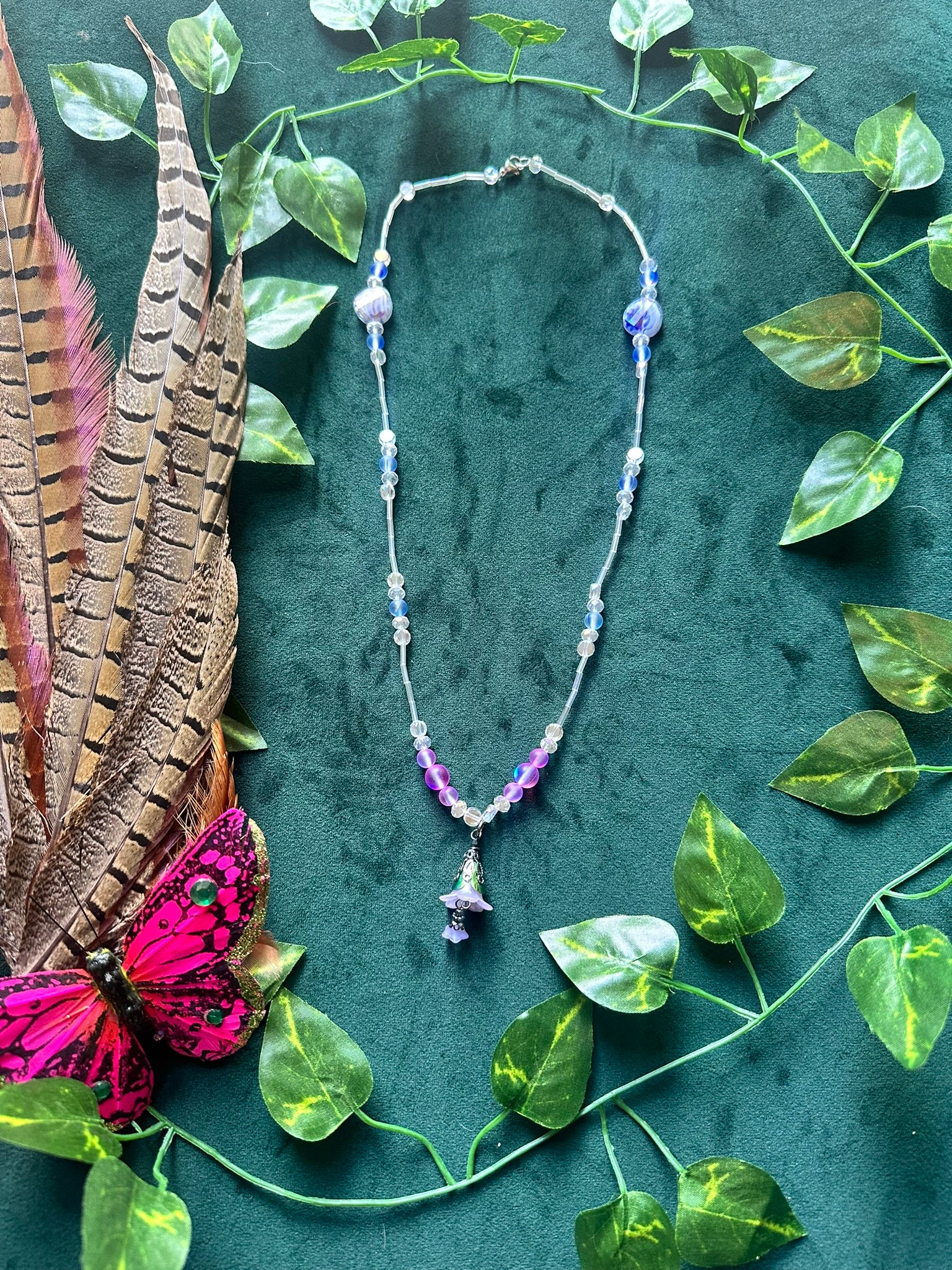 With glassy blues, lavender highlights, and a delicate purple mushroom pendant, Mystic Grove is a walk through enchanted woods. It whispers of fairy lights and hidden realms—ideal for those who carry forest magic in their soul.
