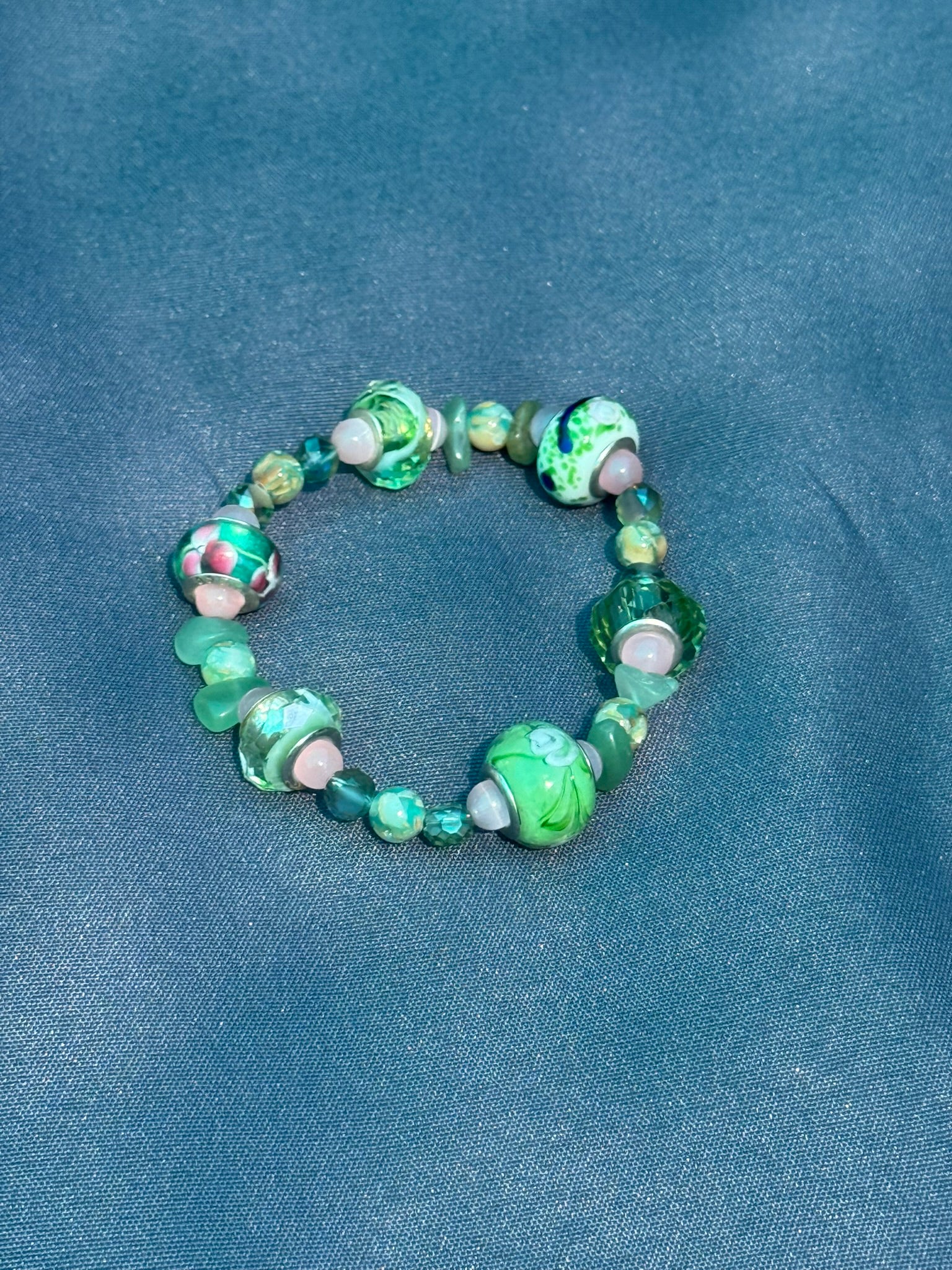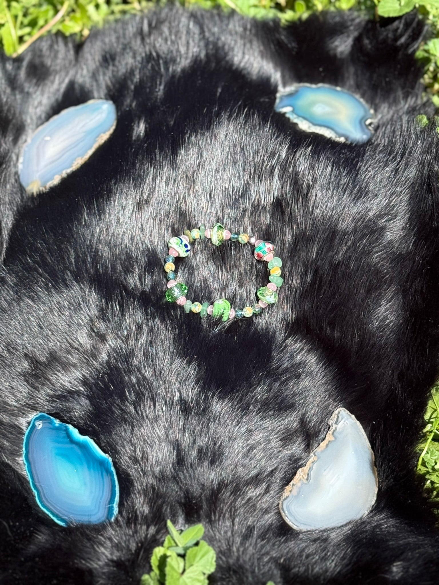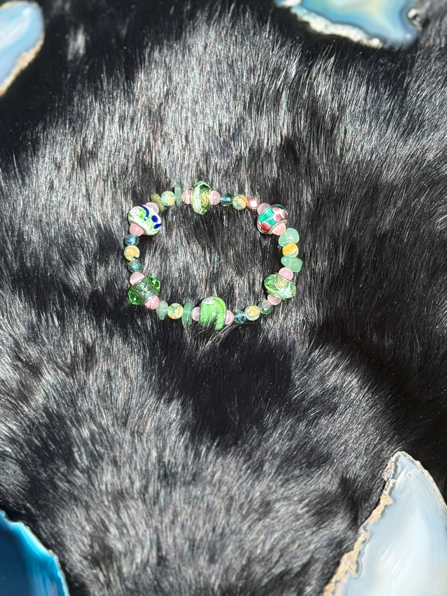 Soft greens, pinks, and shimmering glass beads flow together like a hidden forest blooming in spring. Lighthearted and playful, this bracelet is all about growth, joy, and renewal.