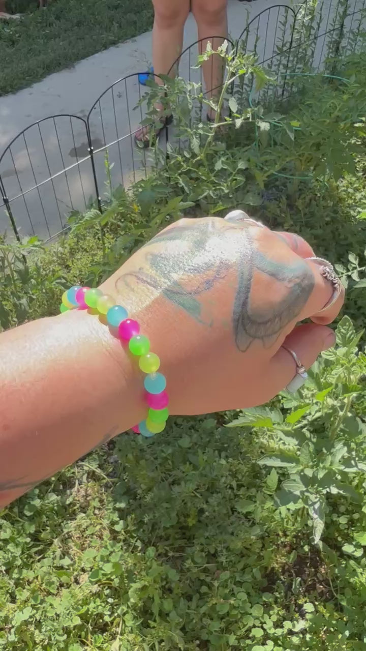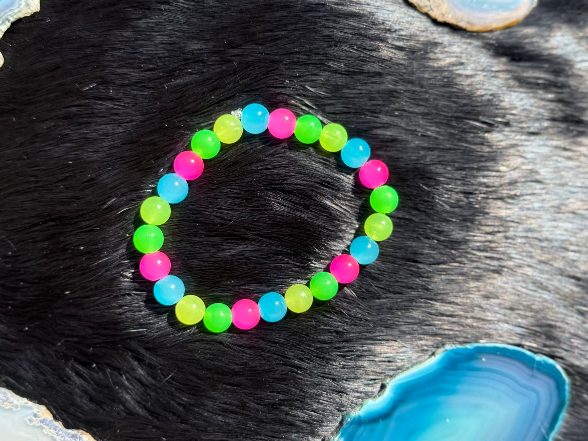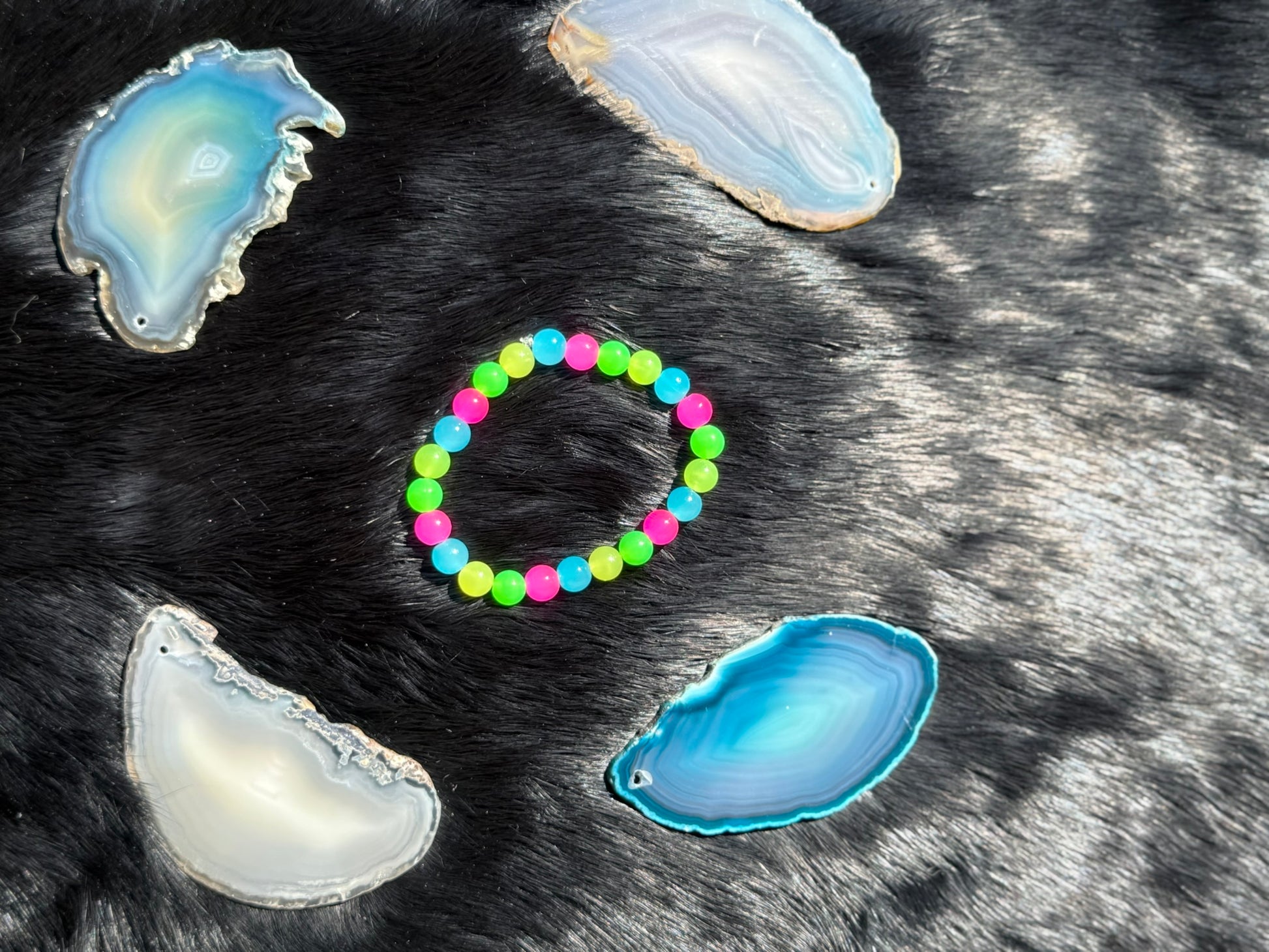 High-voltage pink, green, and blue beads electrify your look with rave-ready energy, sparking confidence every time you move. Blacklight/UV reactive & Glow in the Dark!!!