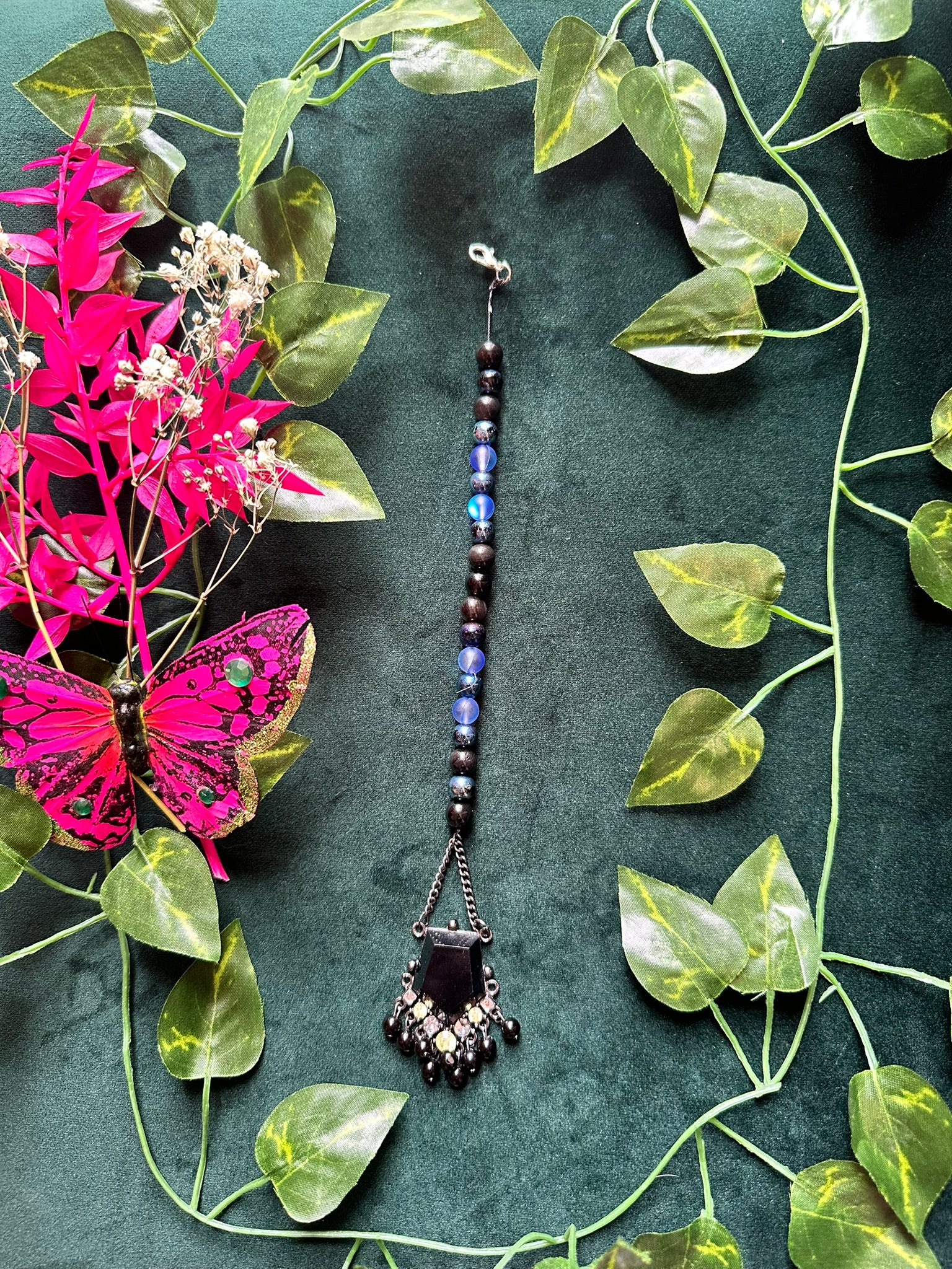 Deep blues and obsidian tones set the mood for Nocturne—a moody, midnight-ready charm with a gothic crystal centerpiece that sways with shadowy elegance.