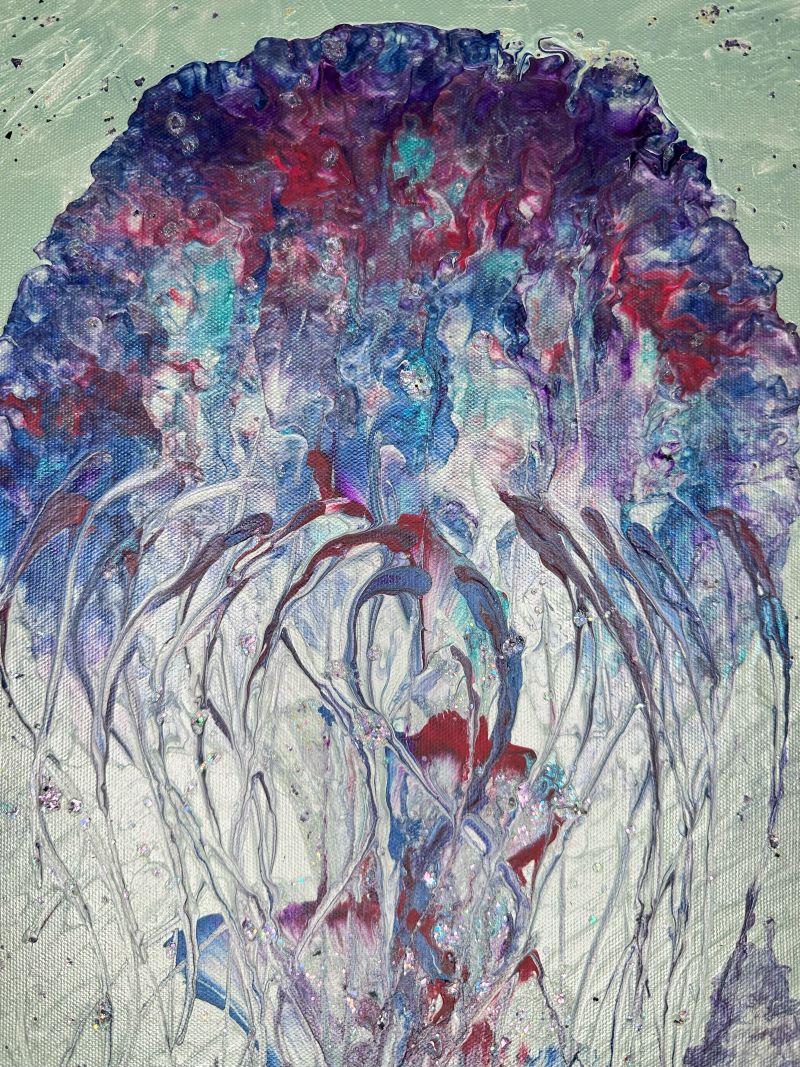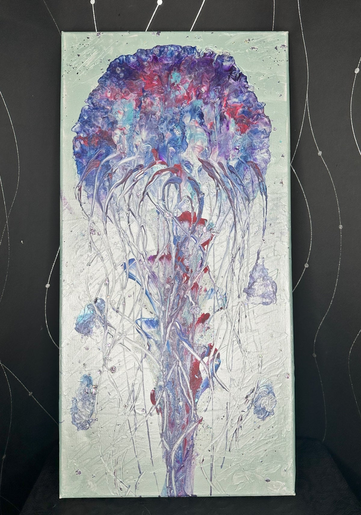 This captivating artwork resembles a glowing jellyfish or a mystical underwater bloom, with its radiant crown of purples, blues, and crimson flowing into delicate, trailing tendrils. The intricate textures and luminous colors evoke the serene beauty of marine life or the enchanting patterns of a dreamlike garden. The soft, light background enhances the otherworldly quality of the piece, inviting viewers to explore its fluid, organic elegance.