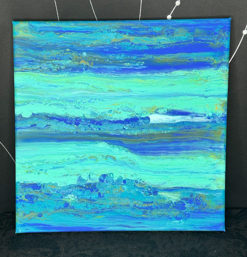This serene artwork captures the tranquil essence of the sea, with layered bands of turquoise, aqua, and deep blue flowing harmoniously across the canvas. Delicate patterns of bubbles and textures evoke the gentle ripple of ocean waves and the quiet hum of water in motion. The subtle touches of gold add a hint of sunlight glistening on the surface, bringing warmth and vitality to the composition.