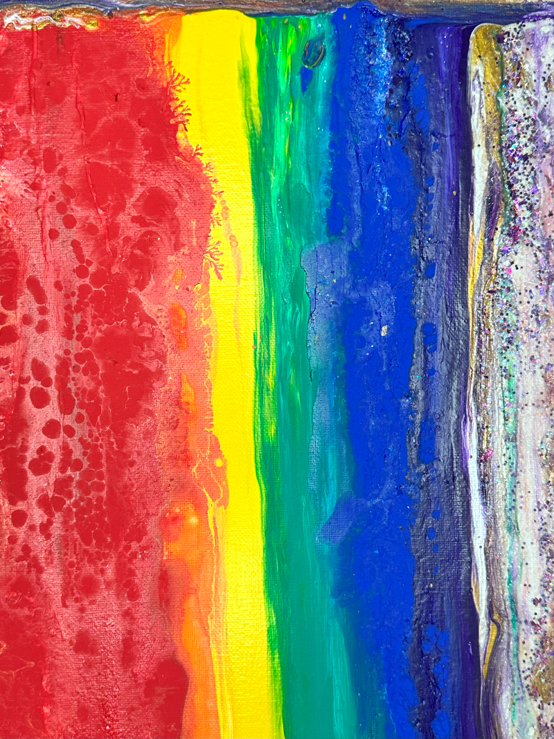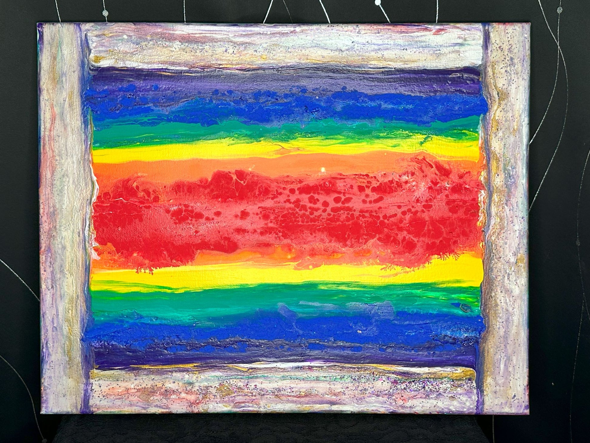 A vibrant spectrum of bold rainbow colors takes center stage, framed by textured bands of soft neutrals and shimmering accents. The rich reds, yellows, greens, and blues radiate energy and joy, creating a striking contrast against the earthy borders. This painting celebrates diversity and unity, offering a dynamic yet grounded composition that uplifts and inspires. Perfect for bringing warmth, inclusivity, and vibrancy to any setting.