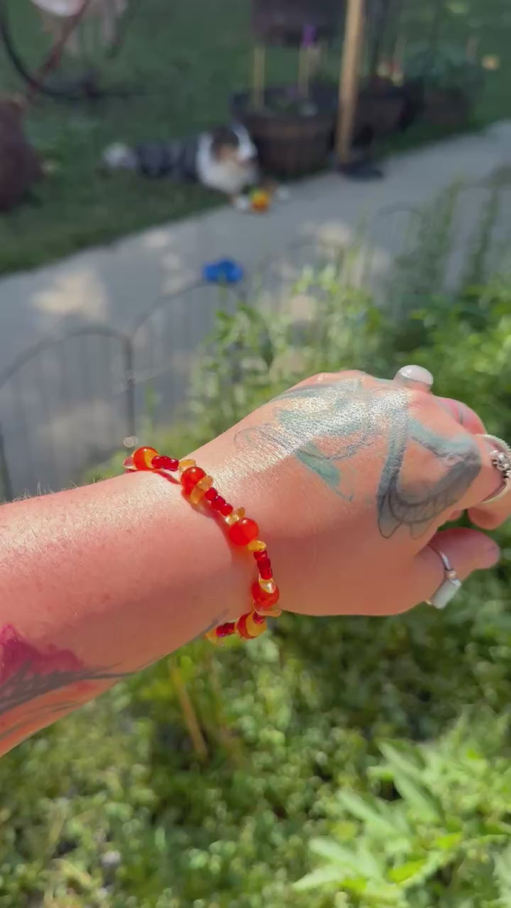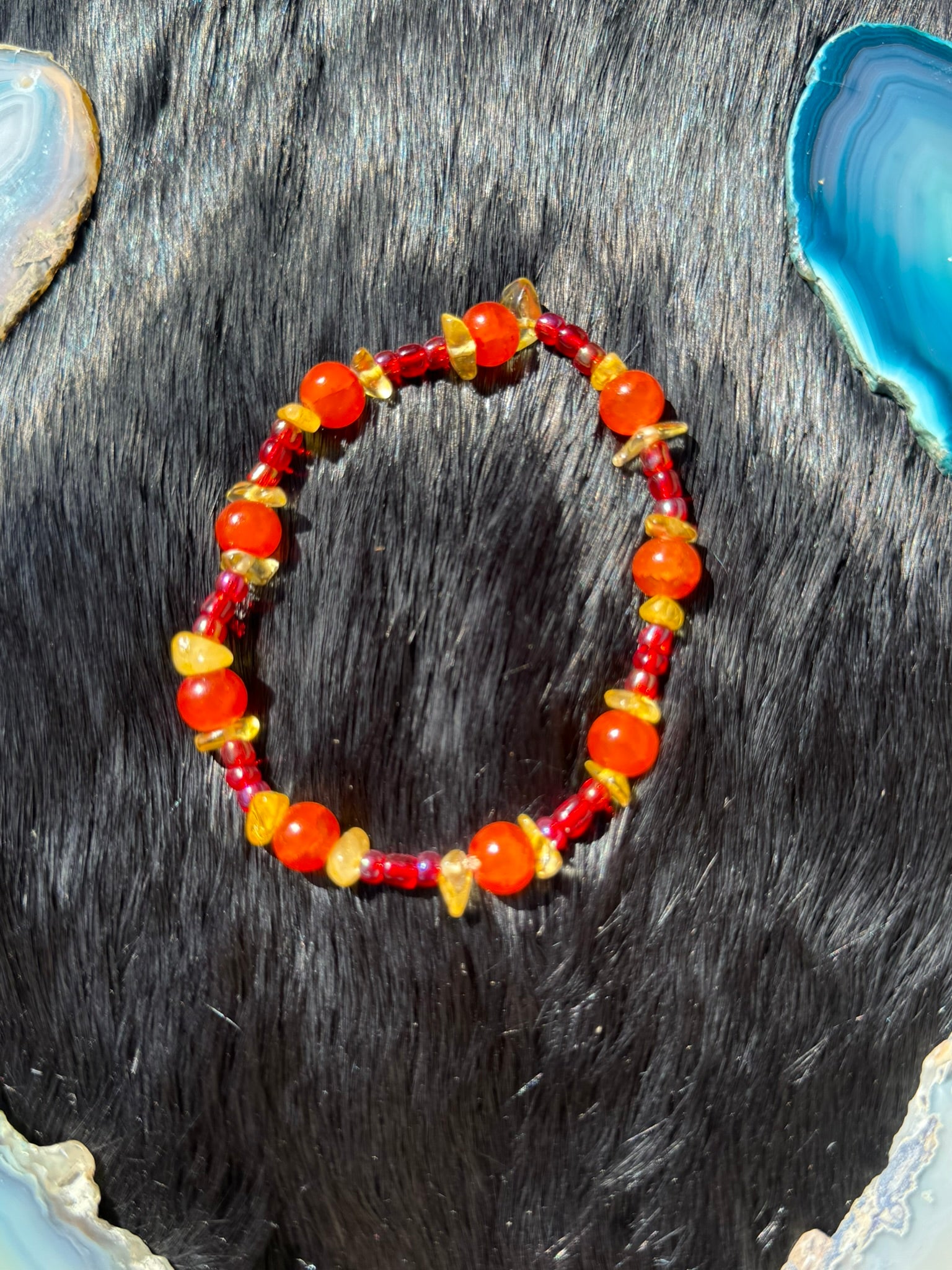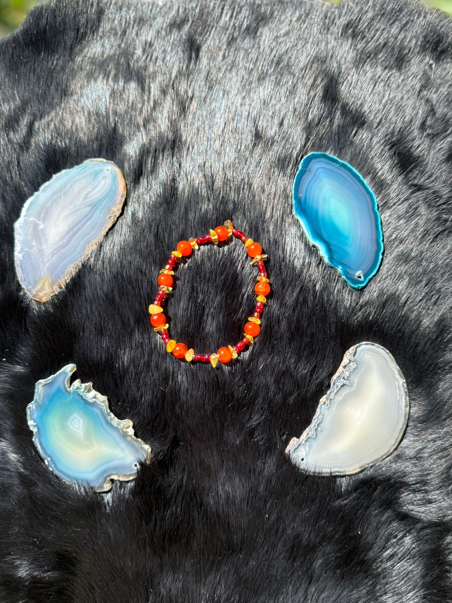 Fiery reds and golden chips blaze together in a design that radiates heat and vitality, like sparks igniting at dusk.