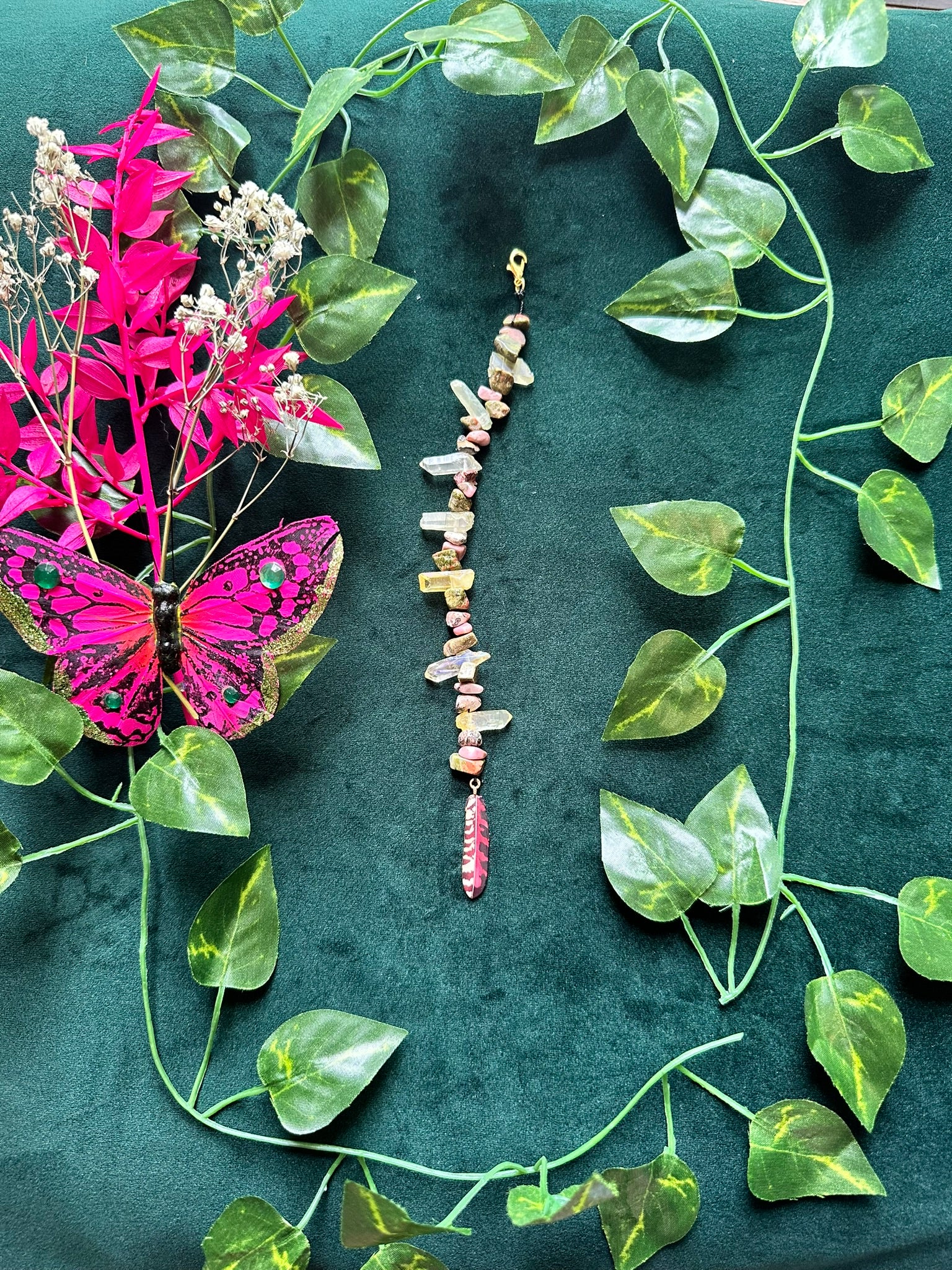 A mix of rose quartz tones and sandy neutrals, this piece evokes grounding and self-love. Finished with a marbled pink feather charm, it’s a reminder to breathe, balance, and bloom.