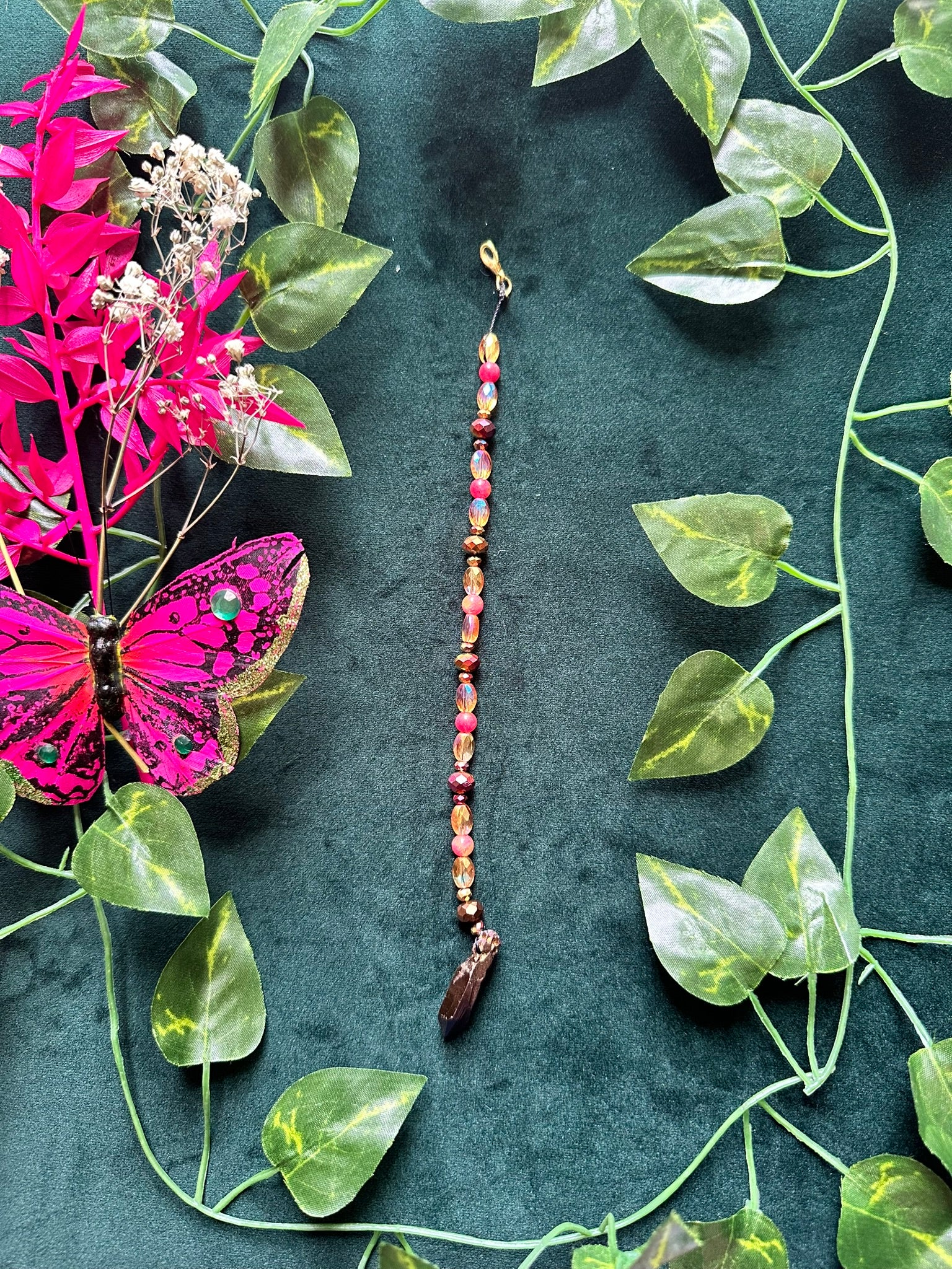 This fire-kissed charm glows with warm sunset hues and finishes in a smoky quartz point. Embers never looked so elegant.