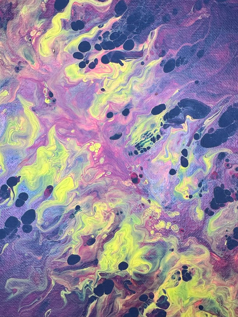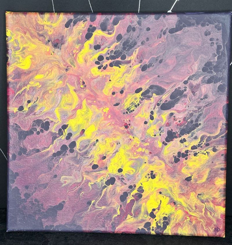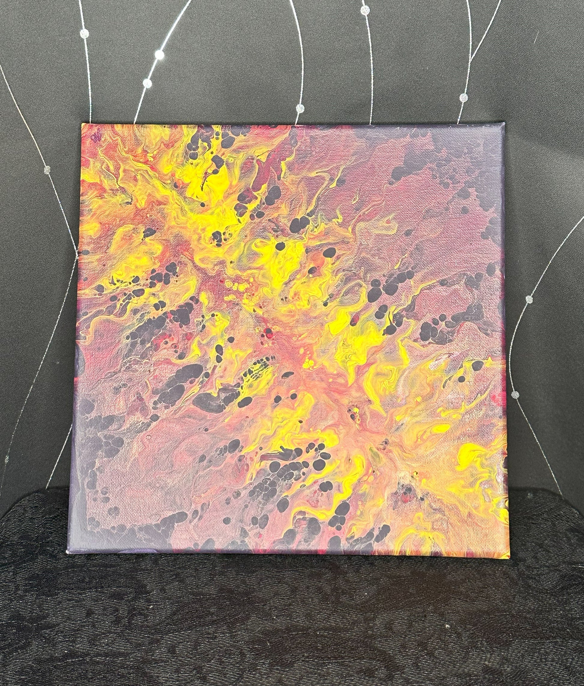 This striking artwork radiates with fiery energy, showcasing vibrant bursts of yellow and orange swirling across a dark maroon and black backdrop. The dynamic interplay of colors and fluid patterns evokes the intensity of solar eruptions or the raw power of a firestorm. Bold black accents punctuate the composition, adding depth and movement, while the layered textures suggest the chaotic beauty of a cosmic event. "Solar Flare" is a captivating piece that brings warmth, drama, and energy to any space.