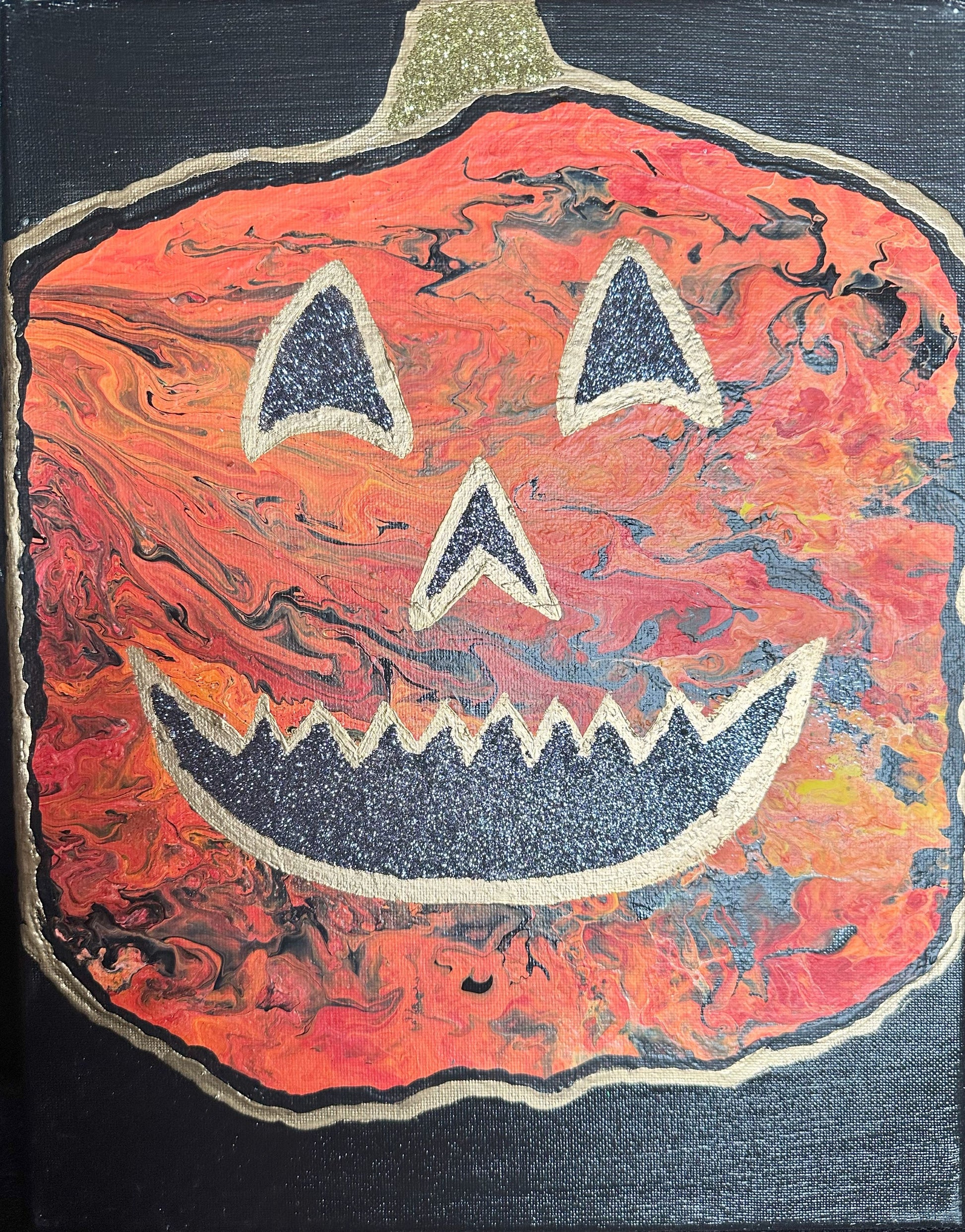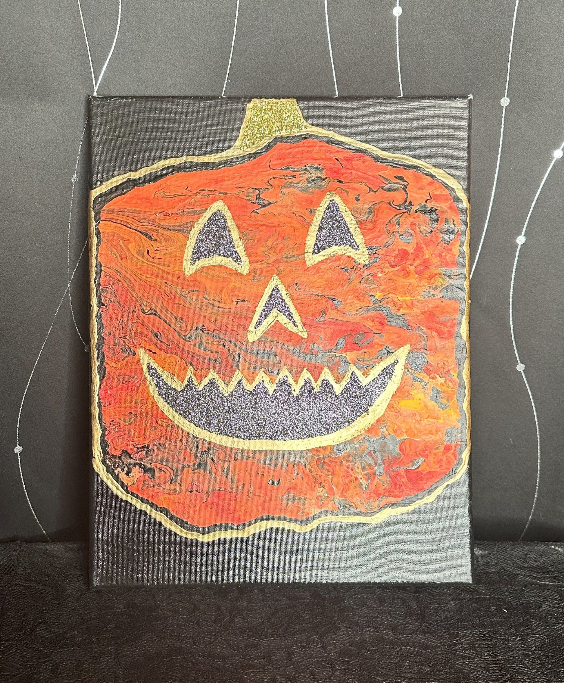 This bold and spirited jack-o'-lantern painting features a mischievous grin framed by fiery orange and black marbling. The sharp, jagged smile and glittering details give it a playful yet eerie charm. With shimmering gold highlights around the edges and stem, this piece is a perfect addition to your Halloween decor, bringing an air of festive fun and creativity to any space.