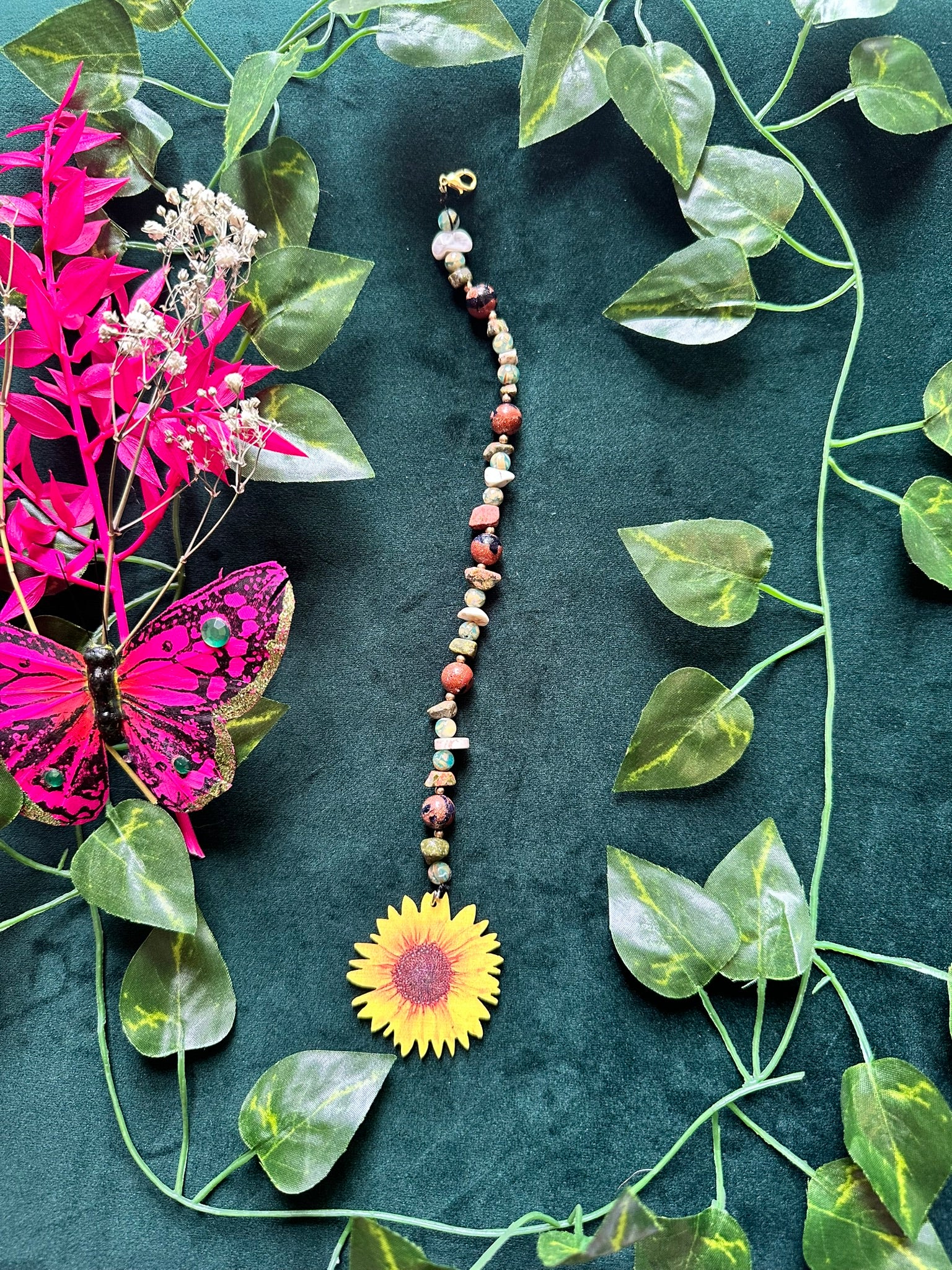 Earthy stone chips, warm neutrals, and a cheerful sunflower pendant bring sunshine into every outfit. Sunchild is for those who radiate joy.