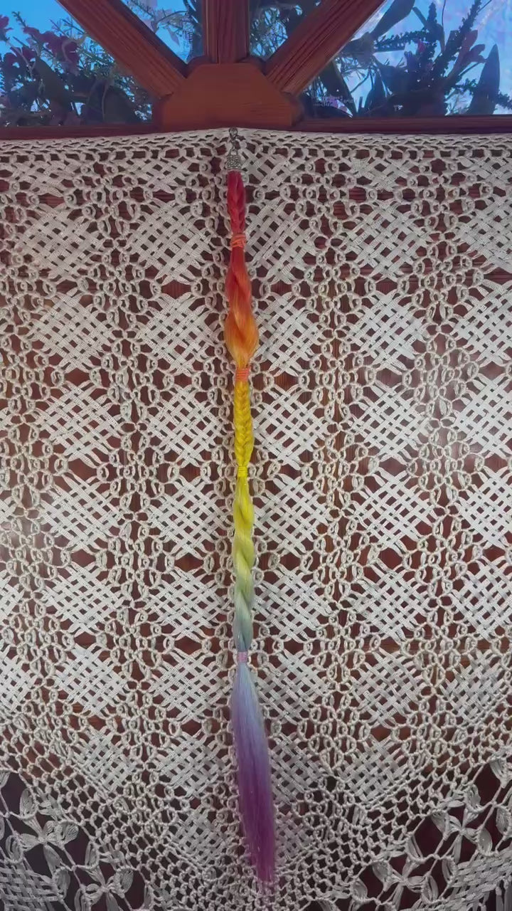 Bring the colors of a glowing sunset into your hairstyle with Sunset Spectrum, a handmade clip-in hair piece designed to add vibrant color, texture, and personality to your look. This piece features a radiant gradient that flows from fiery red and orange into golden yellow, soft green, and deep violet at the tip, creating a beautiful spectrum of color.