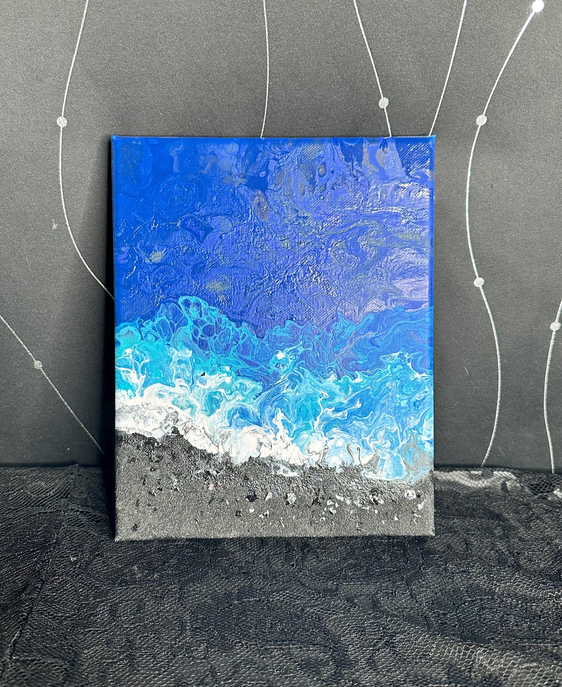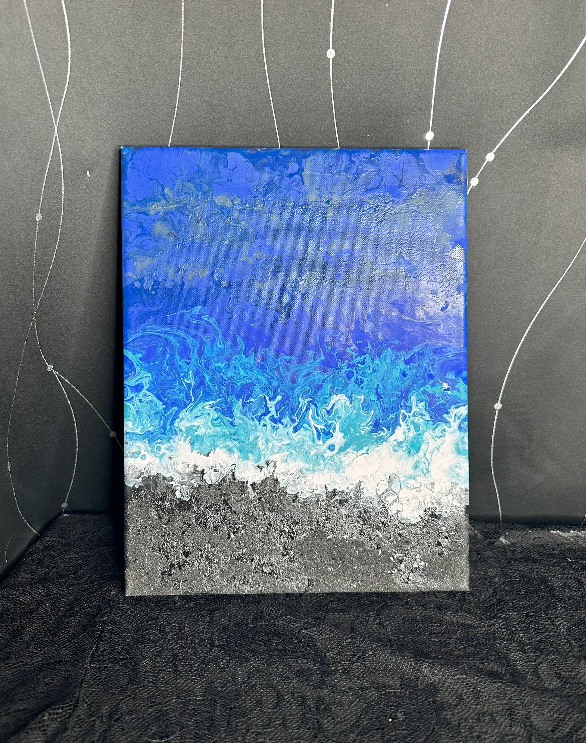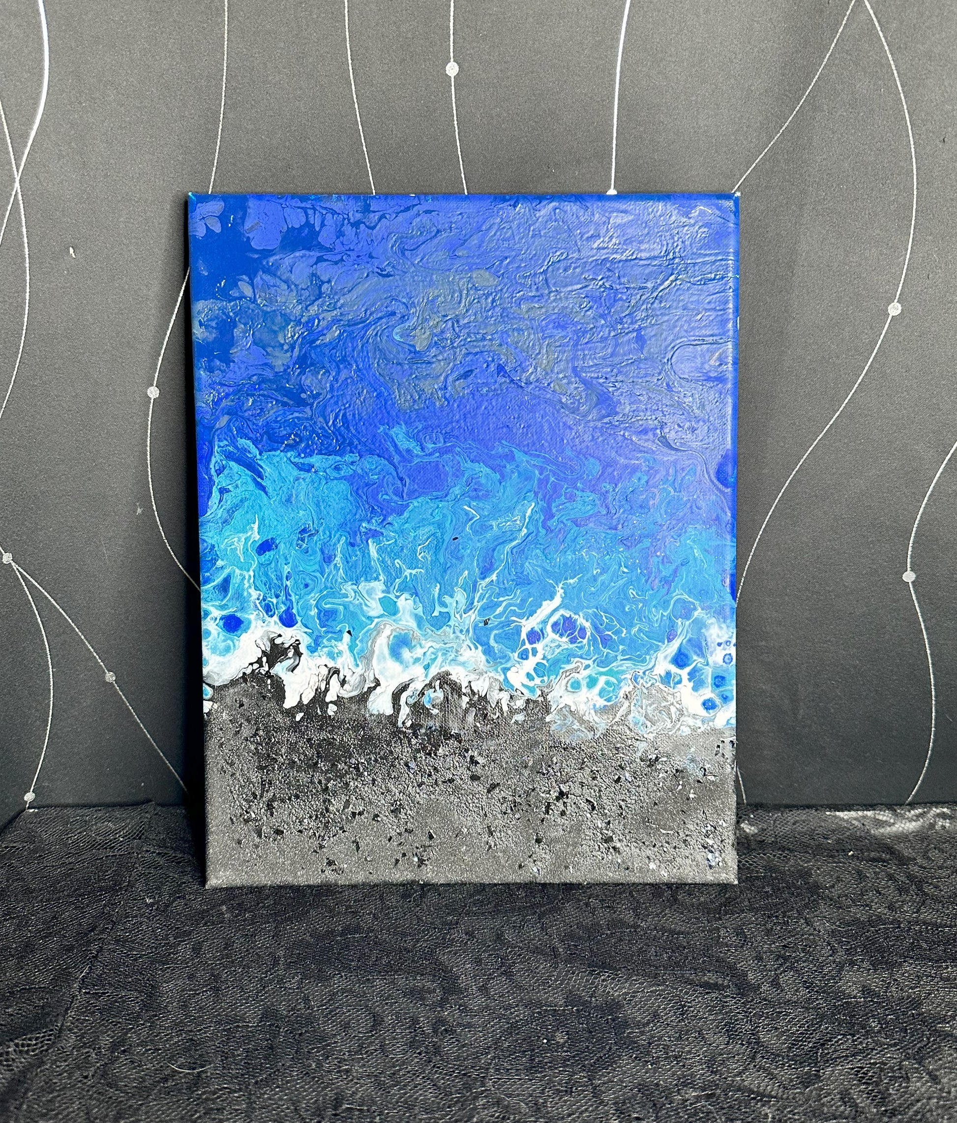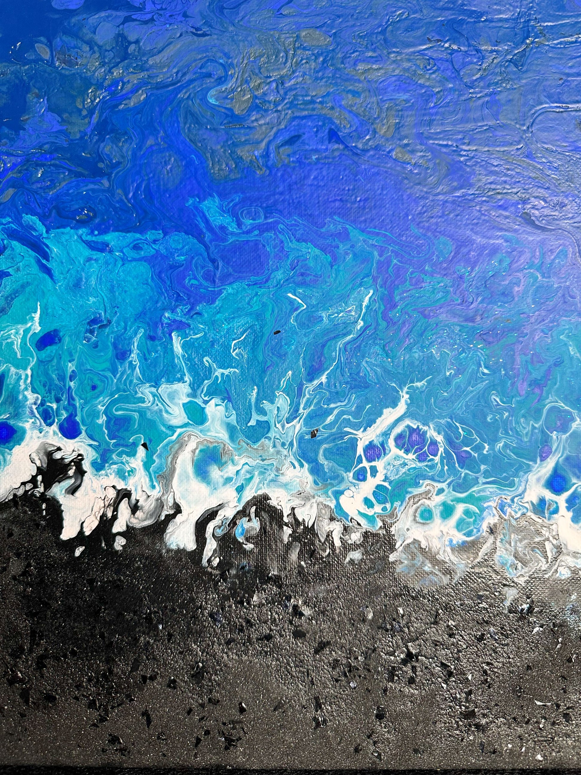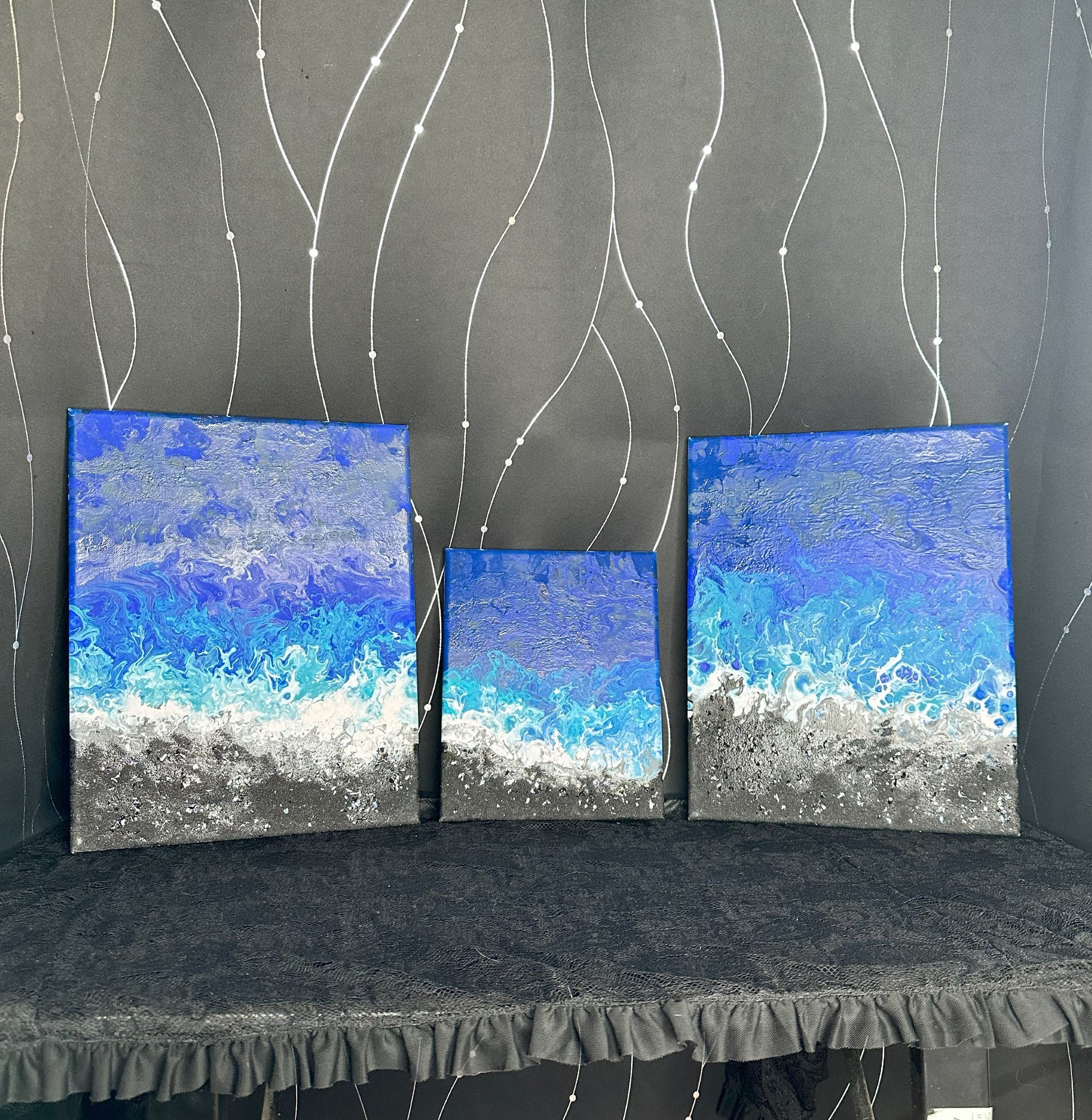 This serene triptych evokes the beauty and power of ocean waves meeting the shore. Layers of deep blue, soft turquoise, and foamy white blend seamlessly into a textured, sandy silver and black base, creating a striking sense of movement and depth. Perfect for lovers of coastal tranquility, this set brings the calming essence of the sea into any space.
