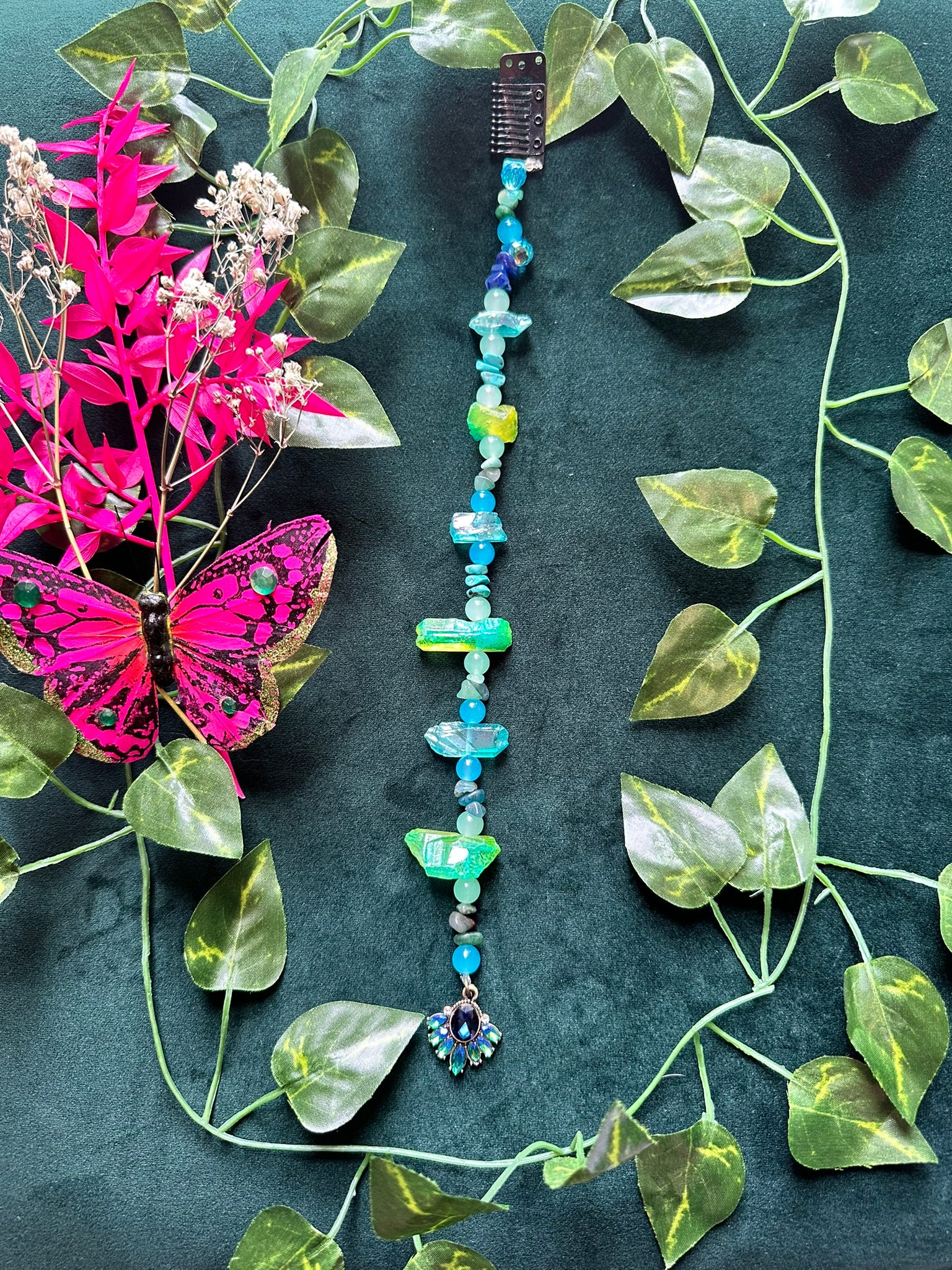 Electric blues and seafoam greens collide in this high-vibe water element charm. With chunky iridescent quartz and a shimmering peacock tail charm, Tidal Spark feels like liquid light.