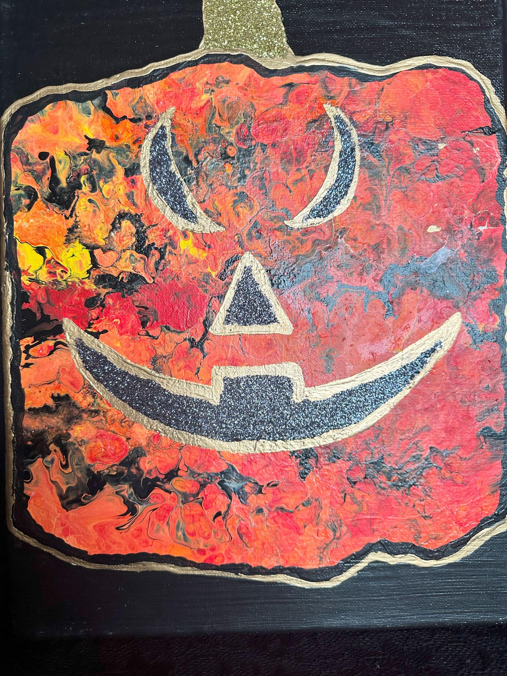 Embrace the whimsical side of Halloween with this joyful jack-o'-lantern painting. The rich, fiery hues of orange are intricately marbled with black, giving the pumpkin depth and personality. Glittering accents outline the stem and features, making the design pop with a radiant glow. A charming addition to your festive decor, sure to bring a smile to all who see it!
