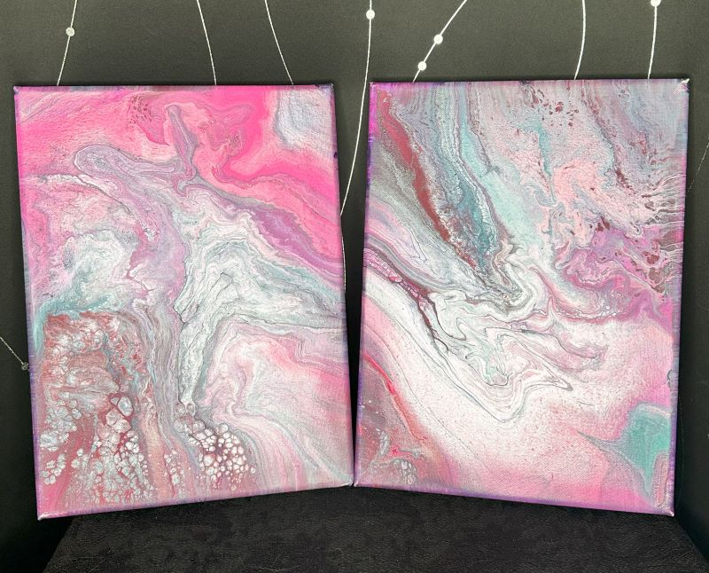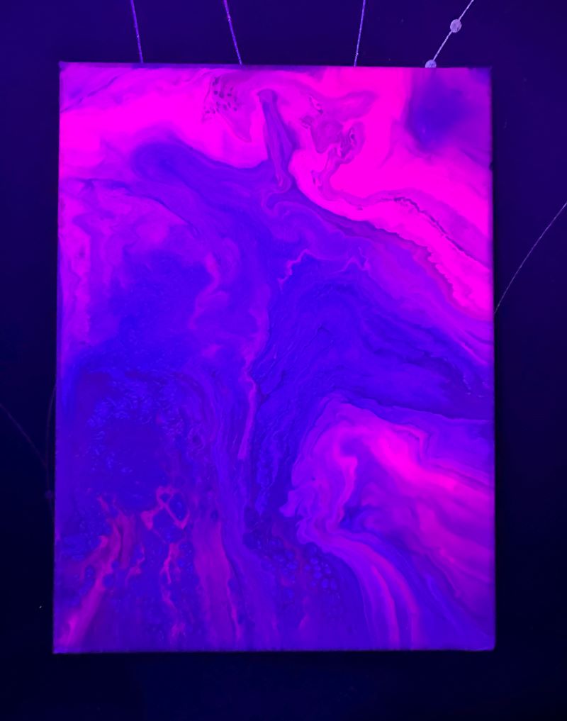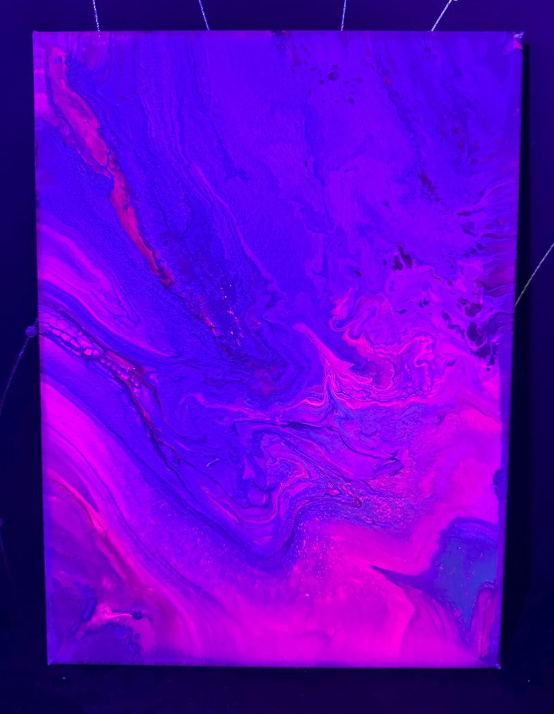 This enchanting pair of paintings glows with the mesmerizing interplay of magenta, violet, and deep indigo hues under blacklight. The fluid, swirling patterns evoke the cosmic beauty of galaxies in motion or the mystique of underwater currents illuminated by bioluminescence. Each canvas tells a story of harmony and energy, their radiant colors and flowing forms capturing the viewer's imagination. "Ultraviolet Reverie" brings a sense of wonder and intrigue, making it a stunning choice for spaces that thrive on bold and dynamic artistic expression.
