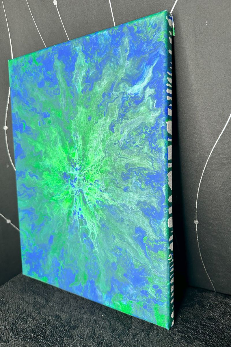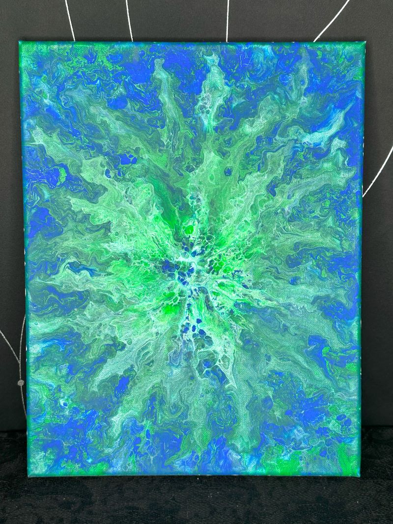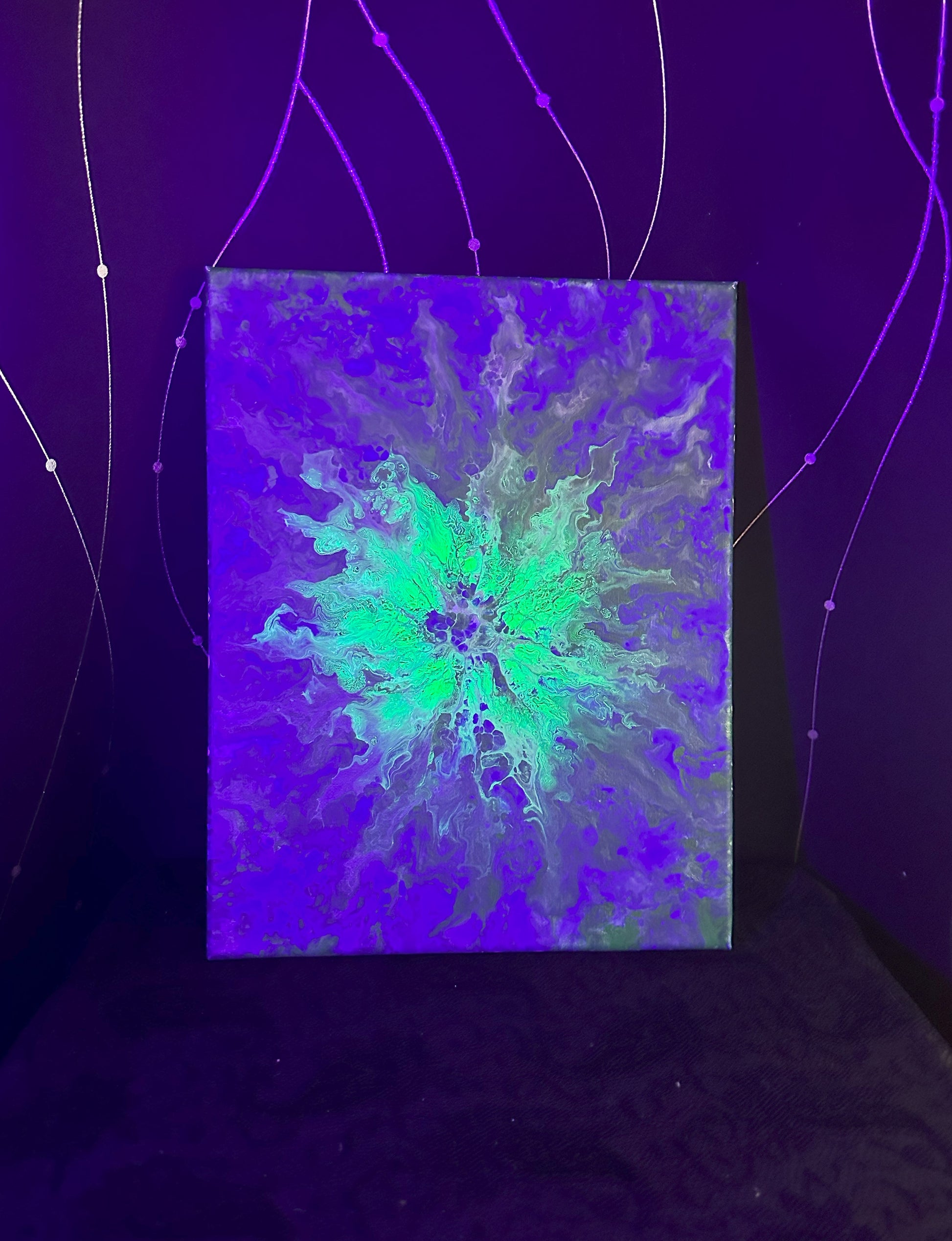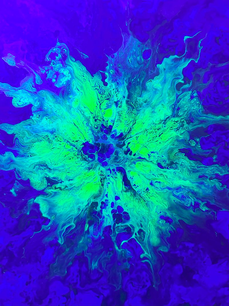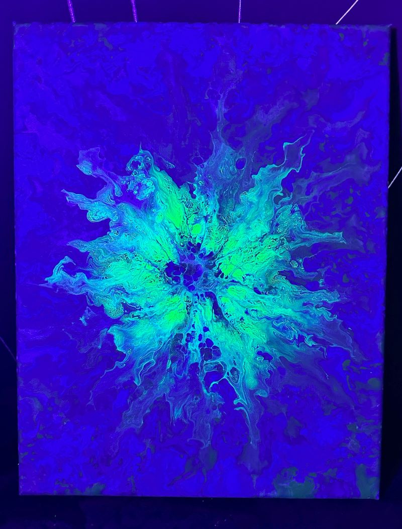 Illuminated under blacklight, this artwork bursts with vibrant neon greens and blues, radiating energy and life from its dynamic central bloom. The fluid, organic patterns suggest the explosive beauty of nature or the glowing heart of a cosmic phenomenon. The interplay of light and texture creates a hypnotic effect, drawing the viewer into its glowing depths. This painting is a celebration of vitality and illumination, making it an ideal centerpiece for a bold and captivating space.
